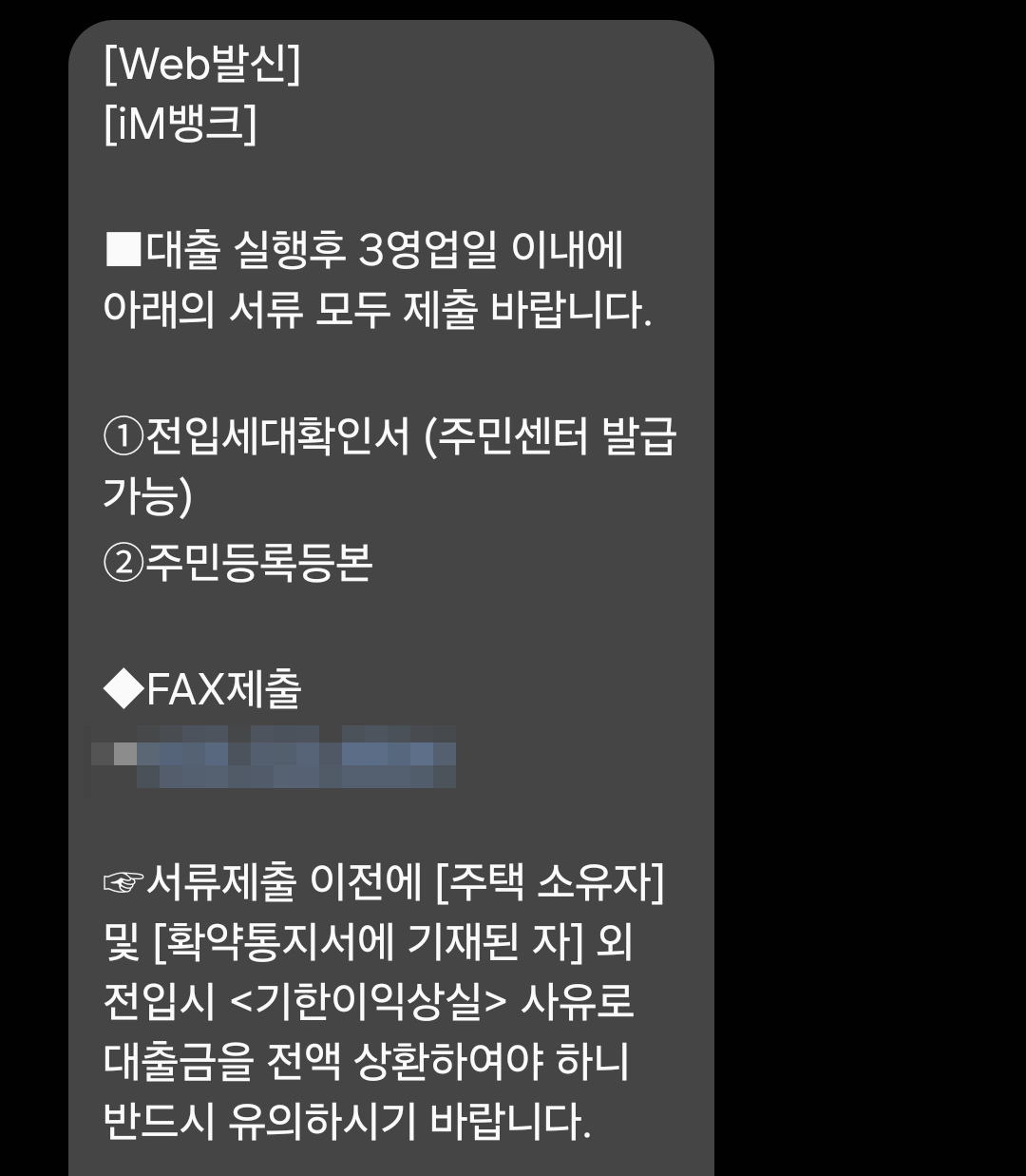 아파트 잔금을 치르고나서 대출을 끼우고 있어서 대출 은행이었던 iM뱅크에서 문자 연락이 왔다. 3영업일 이내에 전입세대확인서와 주민등록등본을 팩스로 보내달라는 내용이었다.