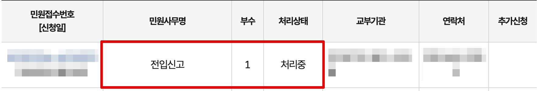 신청 내역을 보면 전입신고, 처리중이라는 내용을 볼 수 있다.