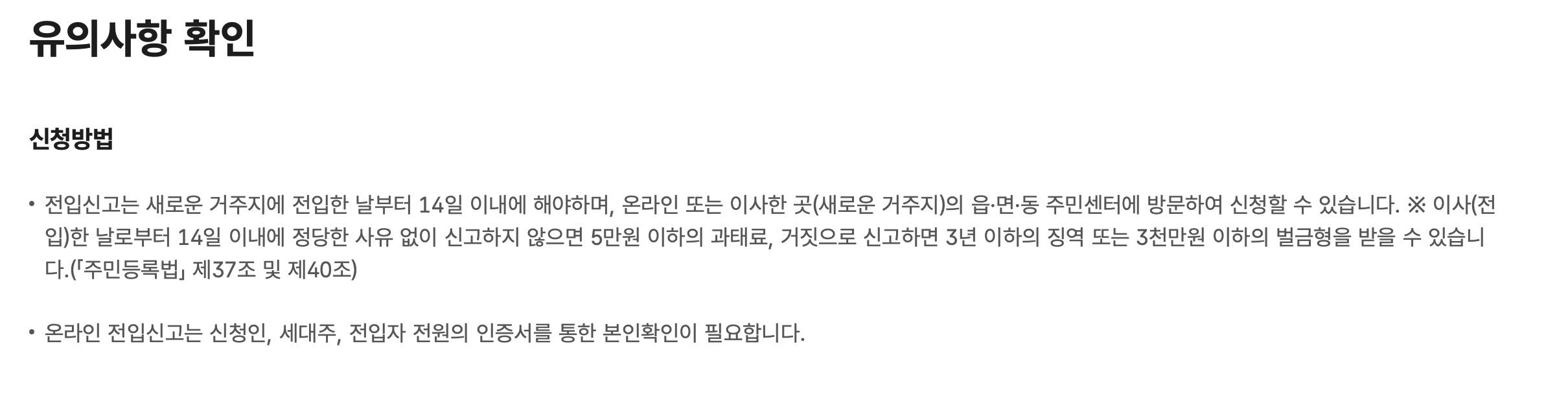 유의사항을 읽어보게되면 새로운 거주지에 전입한 날로부터 14일 이내에 진행해야한다고 한다. 정당한 사유없이 전입신고하지 않으면 과태료가 있다고 한다.