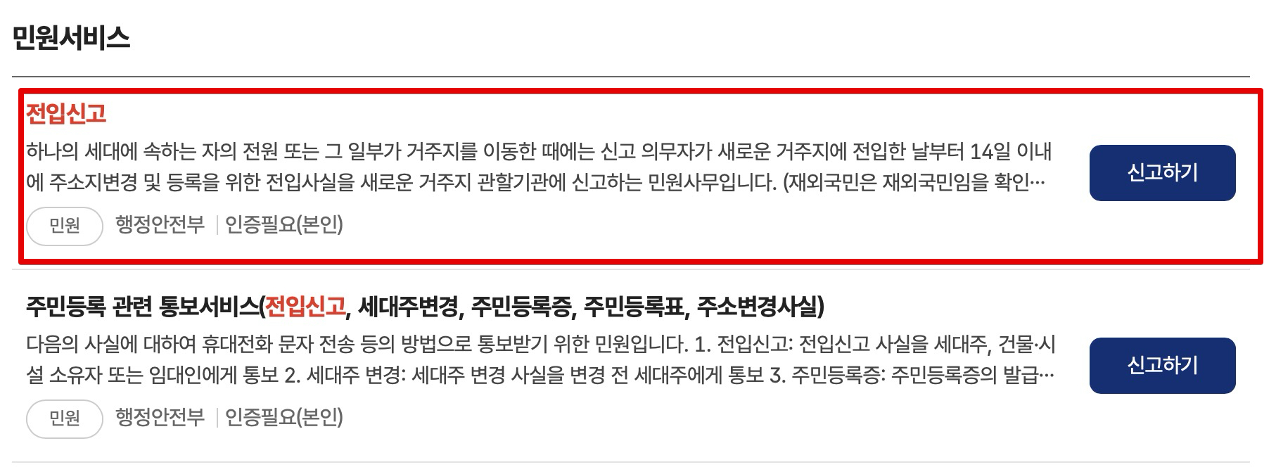 • 전입신고는 정부24 홈페이지에서 신청 가능하다.