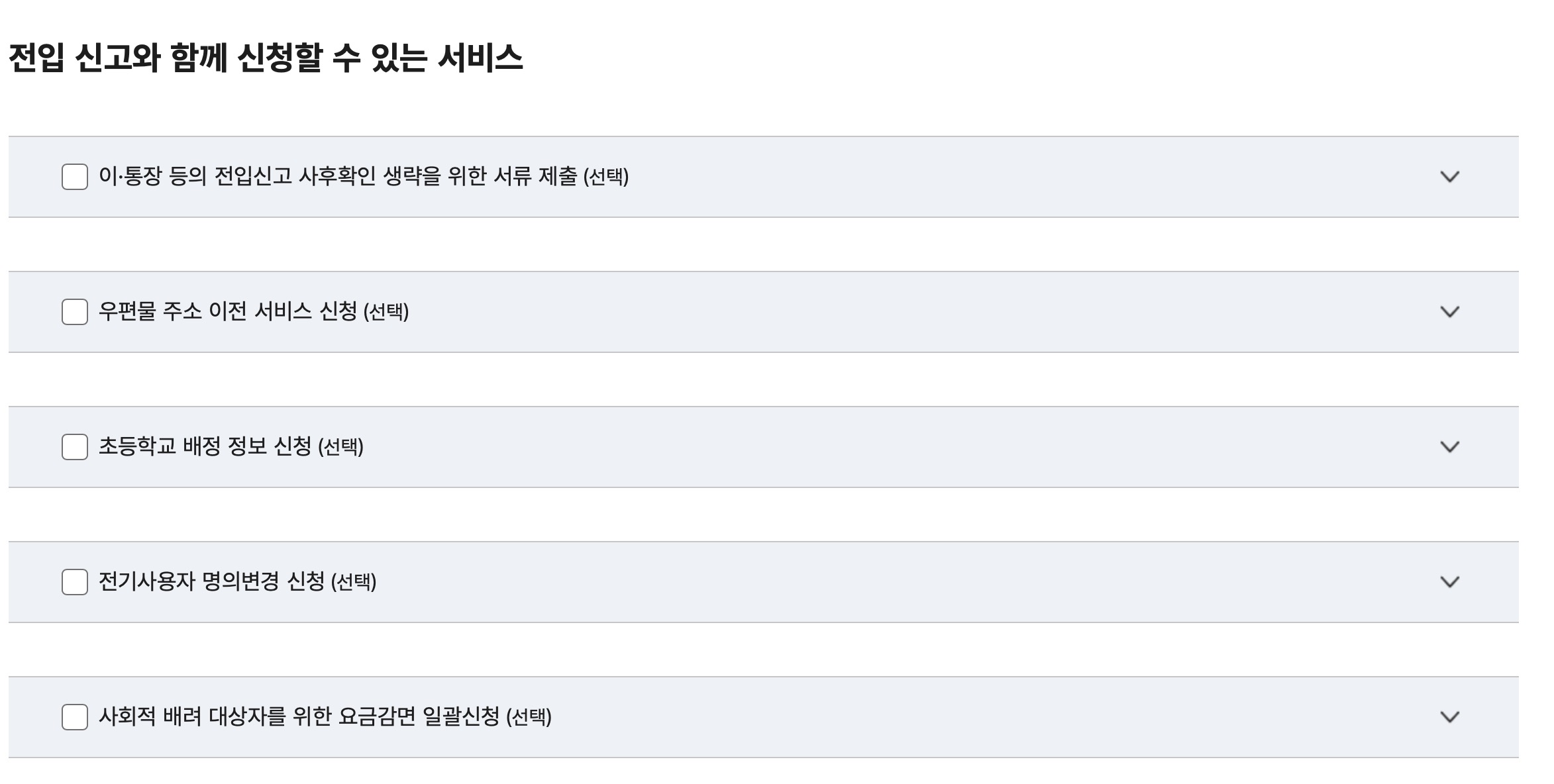 전입신고와 함께 신청할 수 있는 서비스들도 제공된다. 다른것들은 크게 해당사항이 없어서 [우편물 주소 이전 서비스 신청]만 체크하였다. 원래는 이거 따로 다른 곳에서 직접 신청해야하는걸로 알고 있었는데 이렇게 연동해서 제공해주니 좋았다.