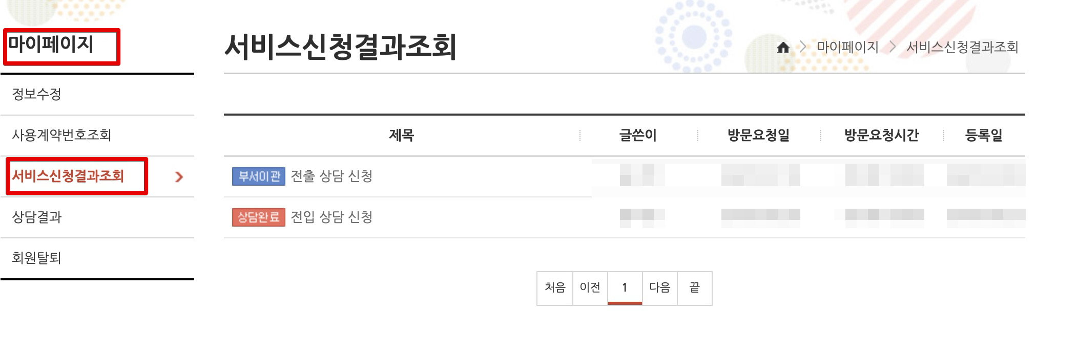 서비스 신청 후 [마이페이지] 에서 [서비스신청결과조회]를 눌러보면 내용을 확인할 수 있다. 서비스신청결과조회 해보니까 지금 살고있는 집(이사 나갈 집)에 이사올 때 전입 신청했던 기록이 남아있어서 옛날 생각도 나고 참 재미있었다. 지금 집에 이사온지도 벌써 6년... 시간 진짜 잘 간다. 엊그제 같은데.