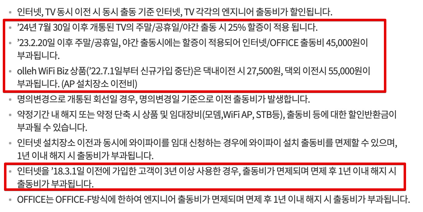 아무튼, 이전설치 비용 관련해서는 2018년 3월 1일 이전에 가입한 고객이 3년 이상 이용했을 경우 출동비를 면제받을 수 있다. 이때에는 1년 이내 해지하면 출동비를 토해내야한다. 돈이나 혜택 받을려고 인터넷 바꾸고 뭐하고 이렇게 하는 분들도 많은걸로 알고 있는데, 나는 귀찮게 그렇게 할 생각이 아예 없기 때문에 계속 이용 예정이다.