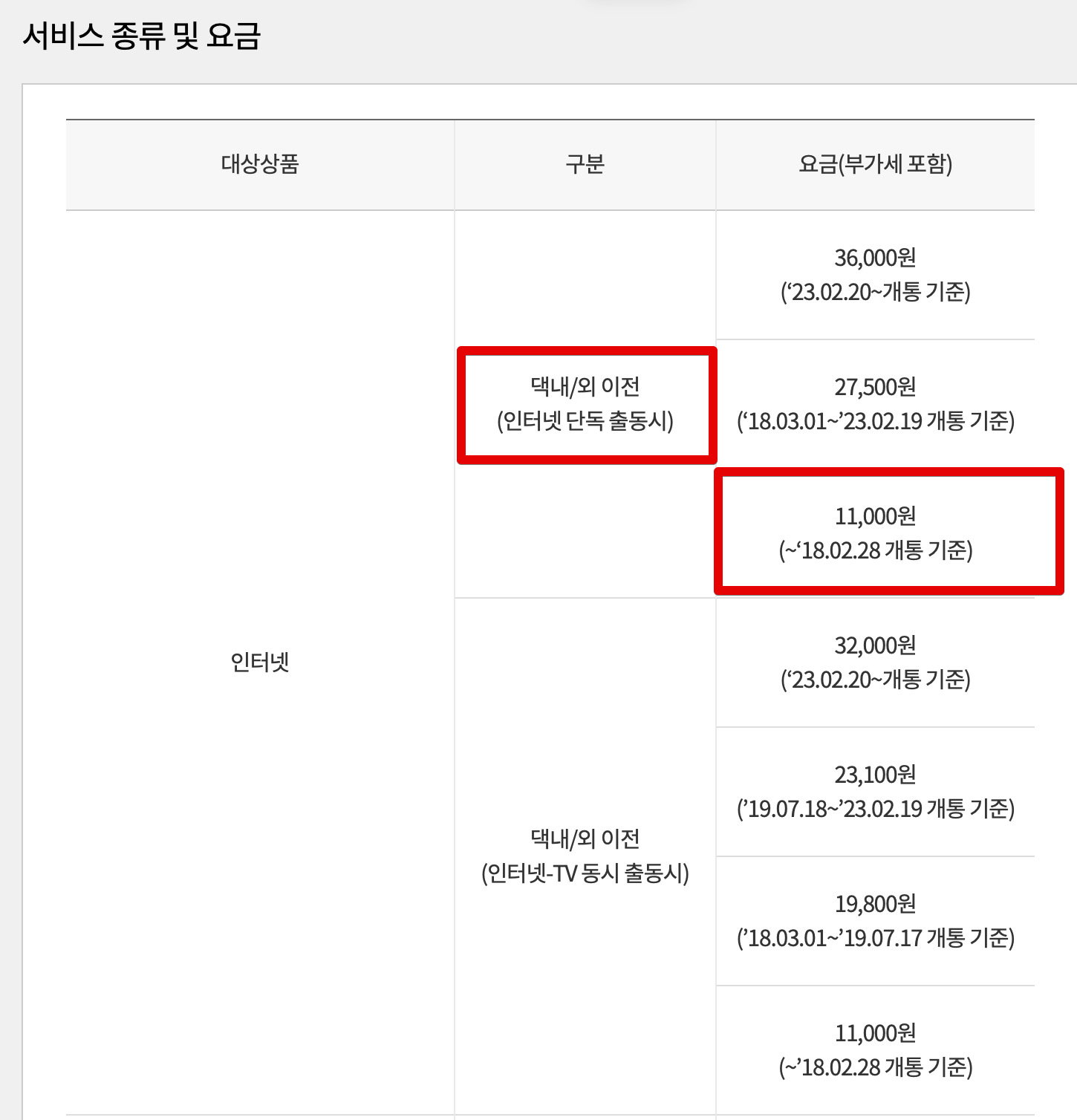 KT 인터넷 이전설치의 경우, 비용이 발생한다. 이때 중요한게 가입기간인 것 같다. 오래도록 이용한 고객에겐 유리한점이 있다. 예를들어 인터넷 단독으로 이전설치를 하게되면 제일 최근 기준이라면 36,000원의 요금이 부과된다. 하지만 18년 이전에 개통했다면 11,000원이고 그보다 더 오래썼으면 무료로도 받을 수 있다.