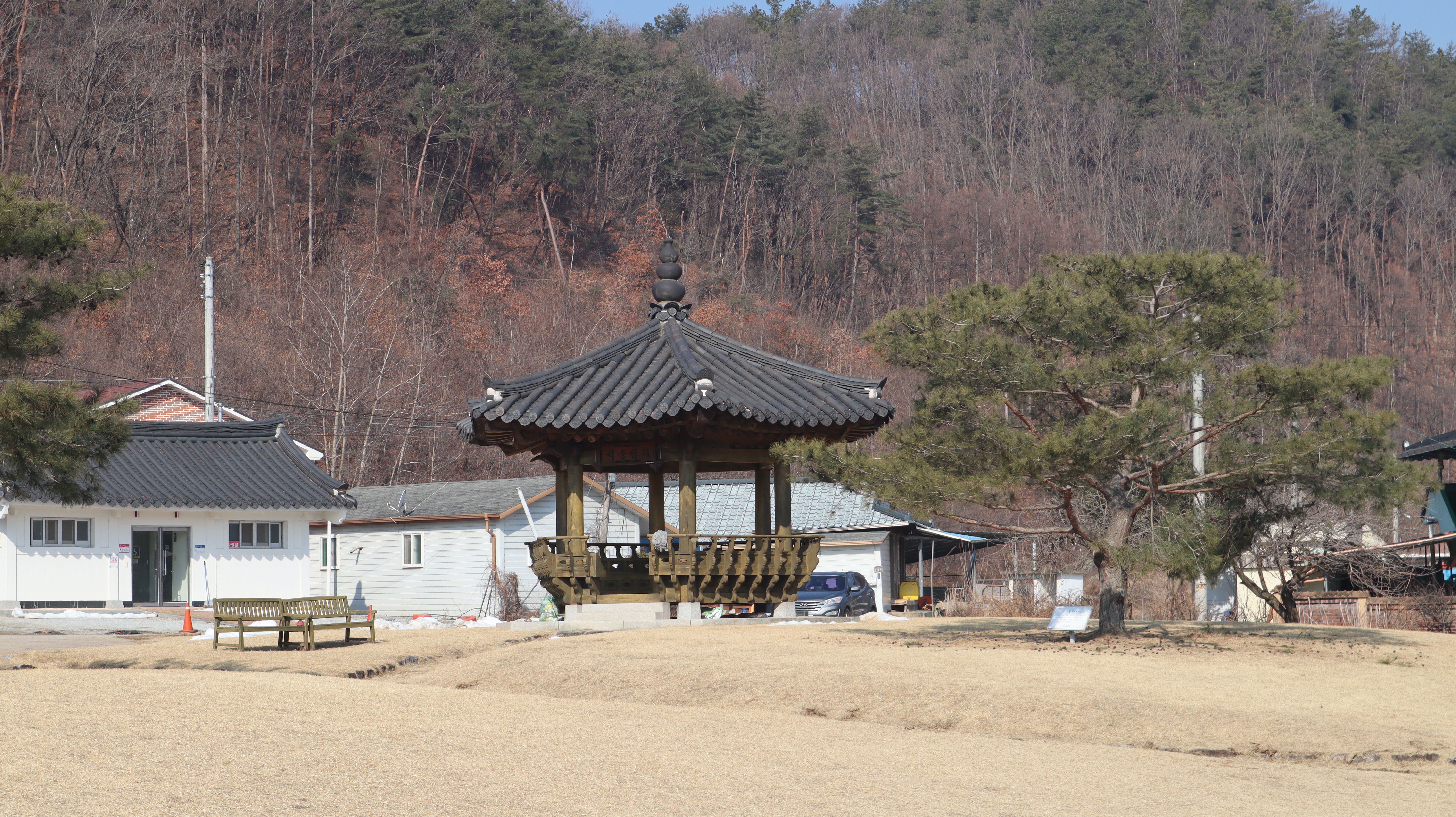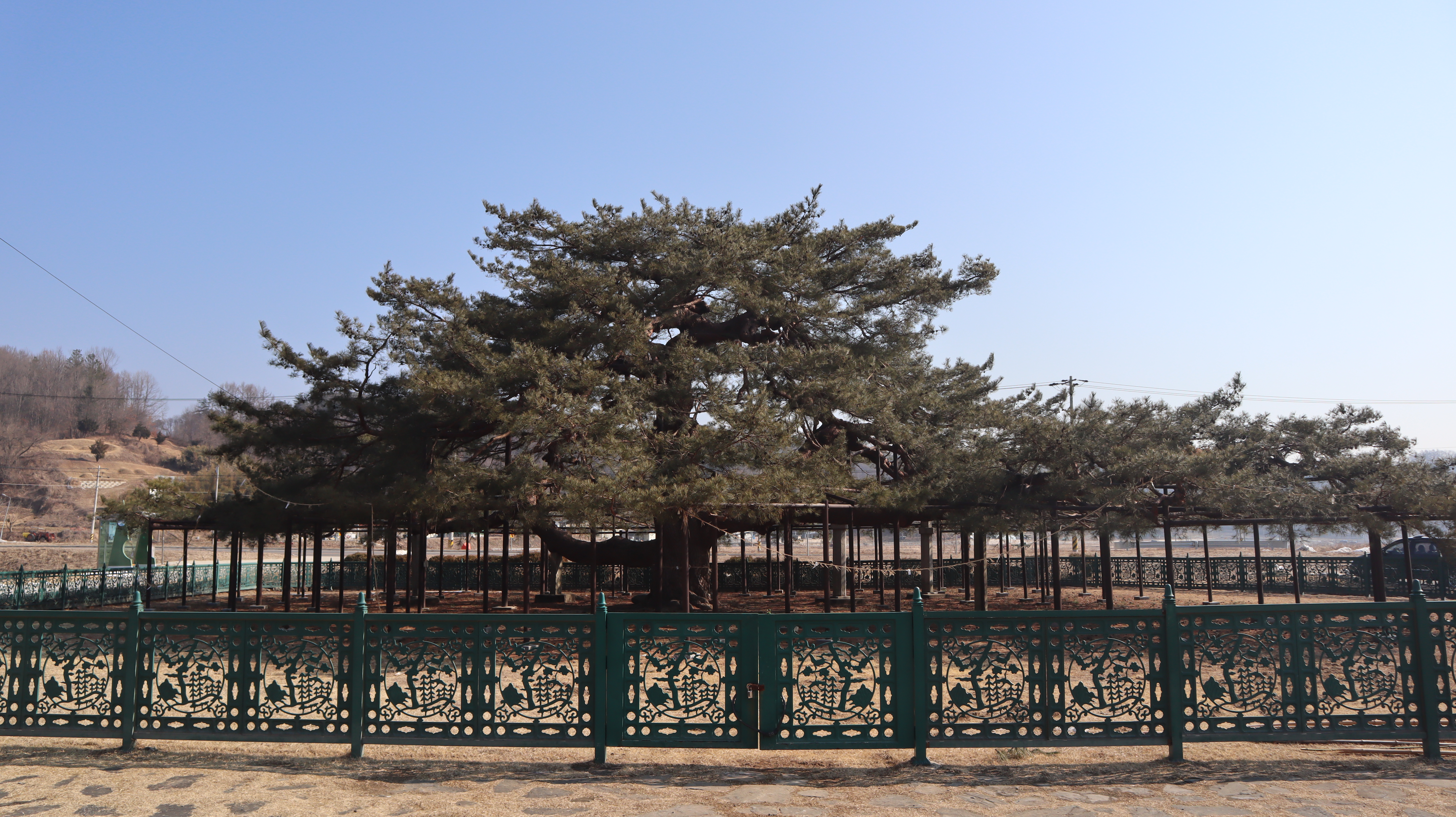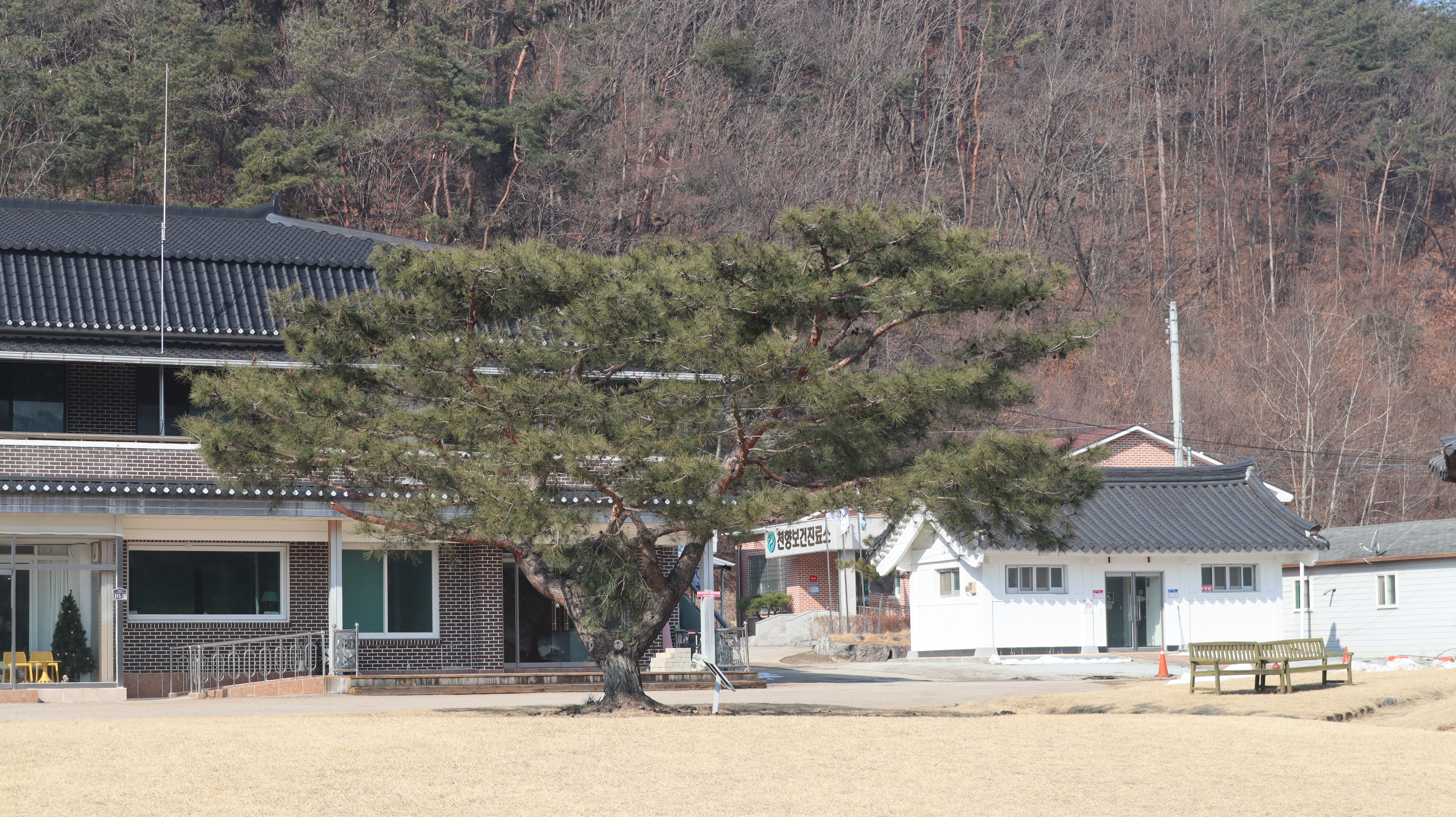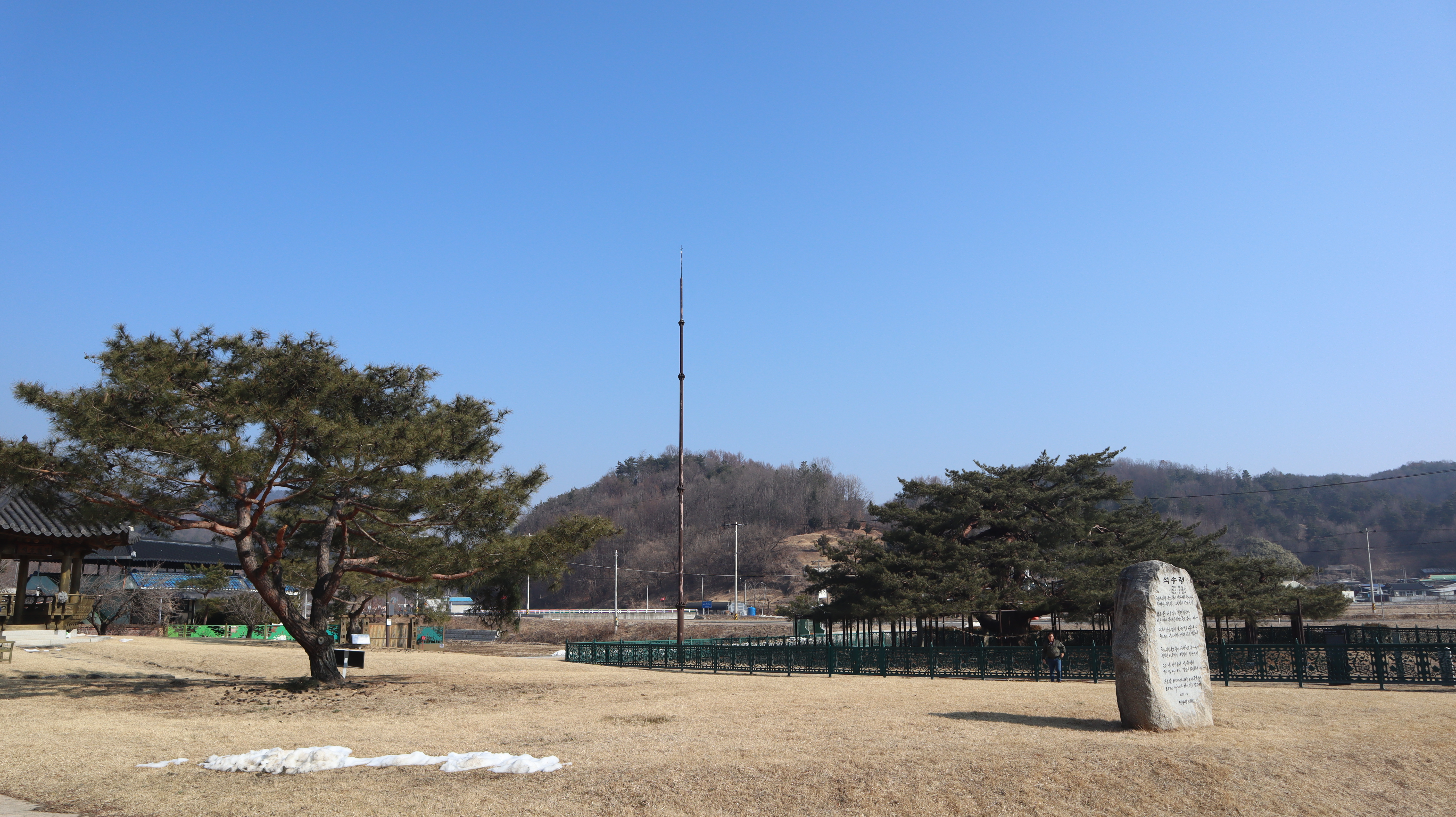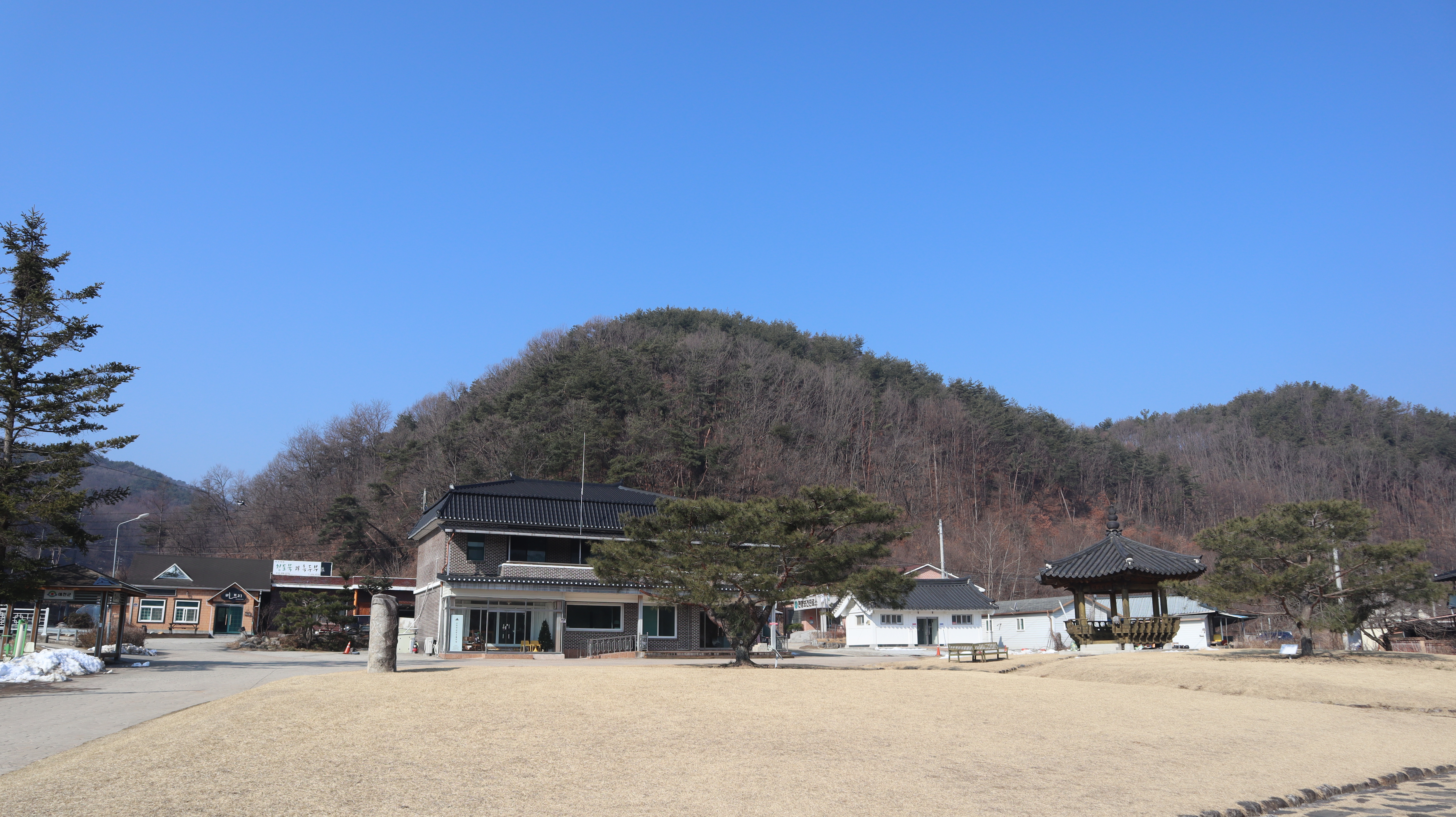 석송령 주변은 산맥이 아름답고 잔디밭도 예쁜 곳인데 이른 봄에 방문했던터라 아직은 초록빛이 아닌 갈색빛 땅을 보여주고 있습니다.