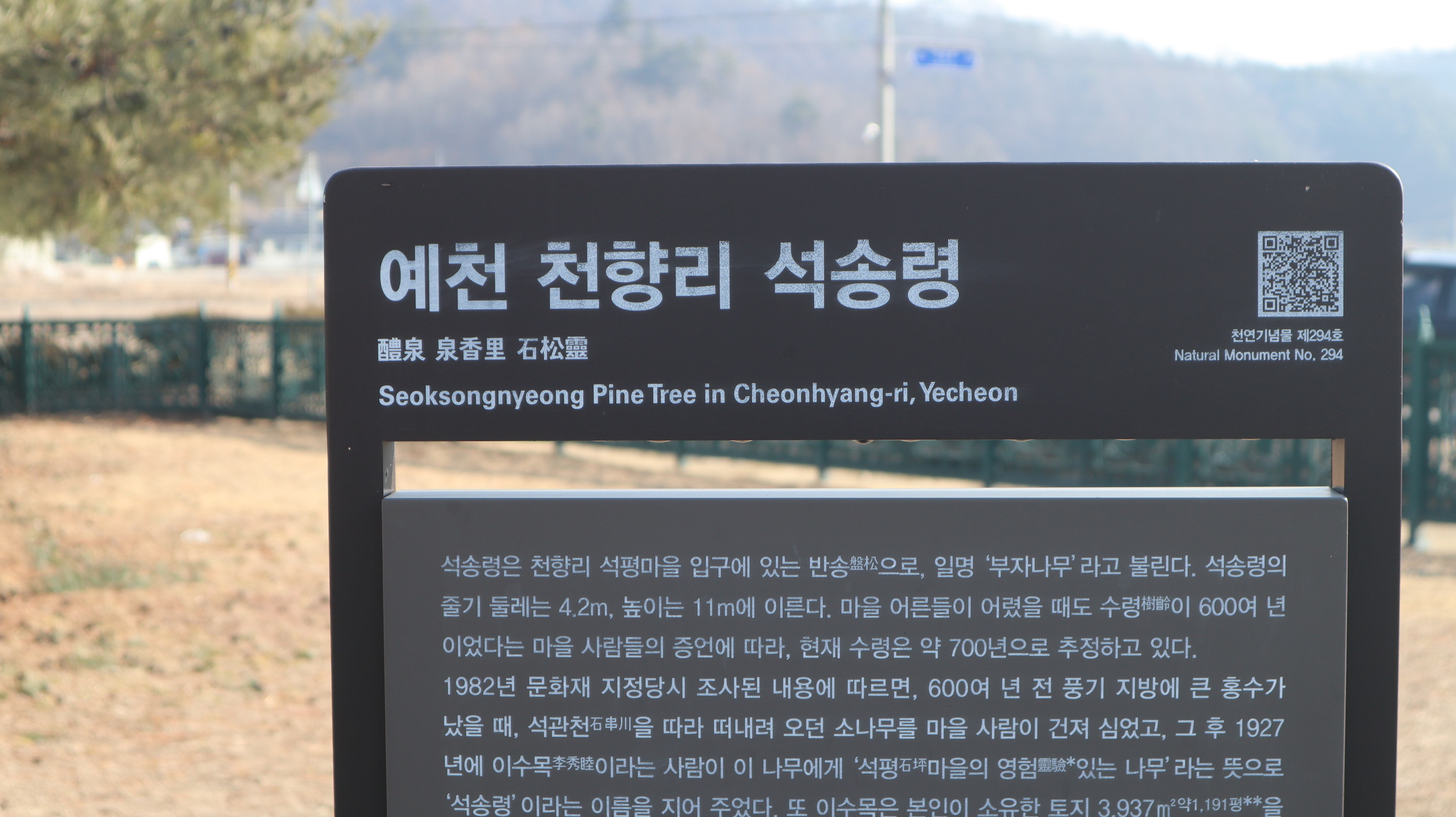 예천 천향리 석평마을 입구에 있는 석송령은 석송령 가까이에 가면 좀 더 자세한 설명을 확인할 수 있습니다. 천연기념물 제294호로 지정되어 관리되고 있습니다. 일명 부자나무라고 불리는 석송령에 대한 정보와 스토리로 재미있으니 읽어보면 도움이 됩니다.