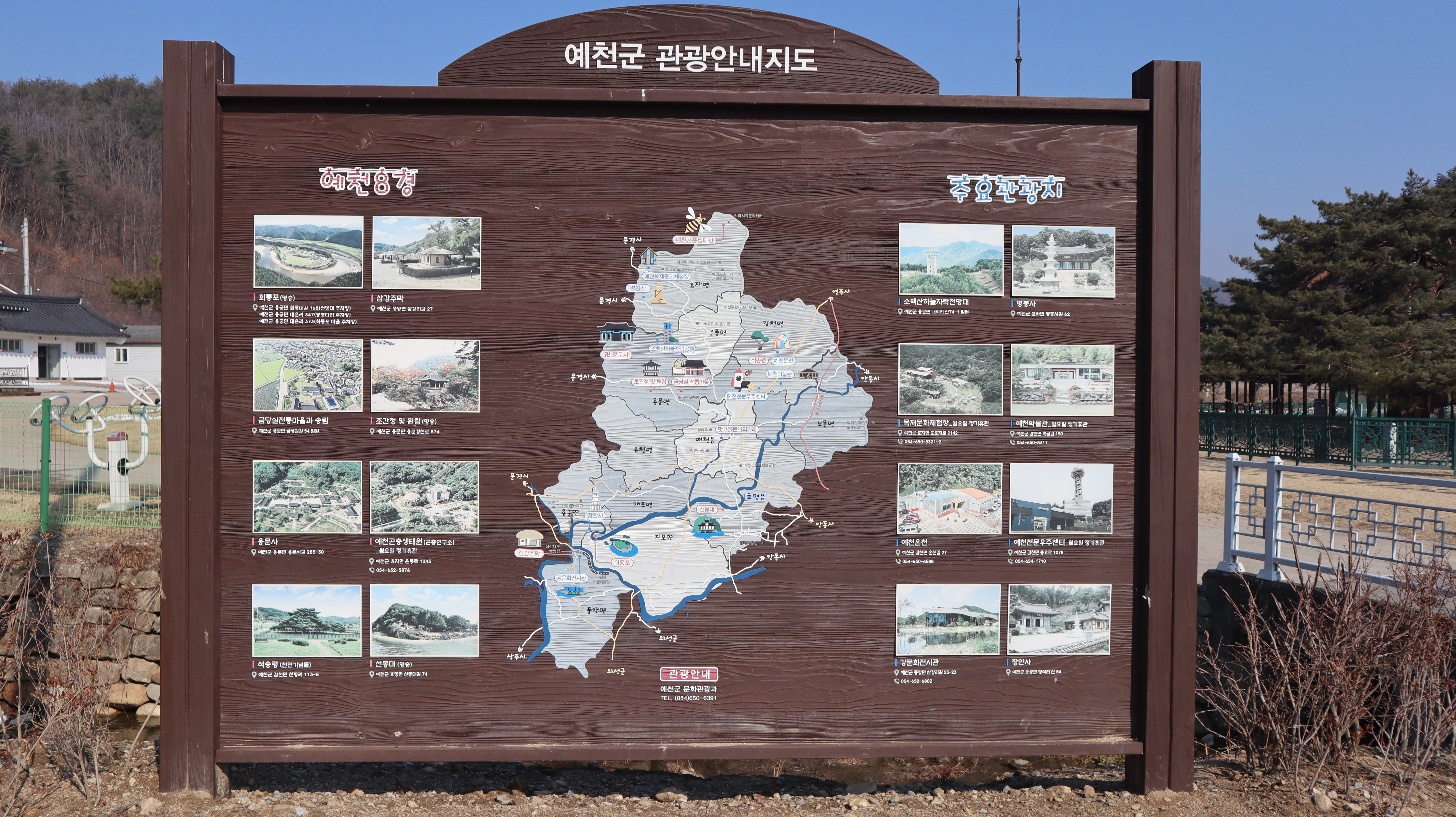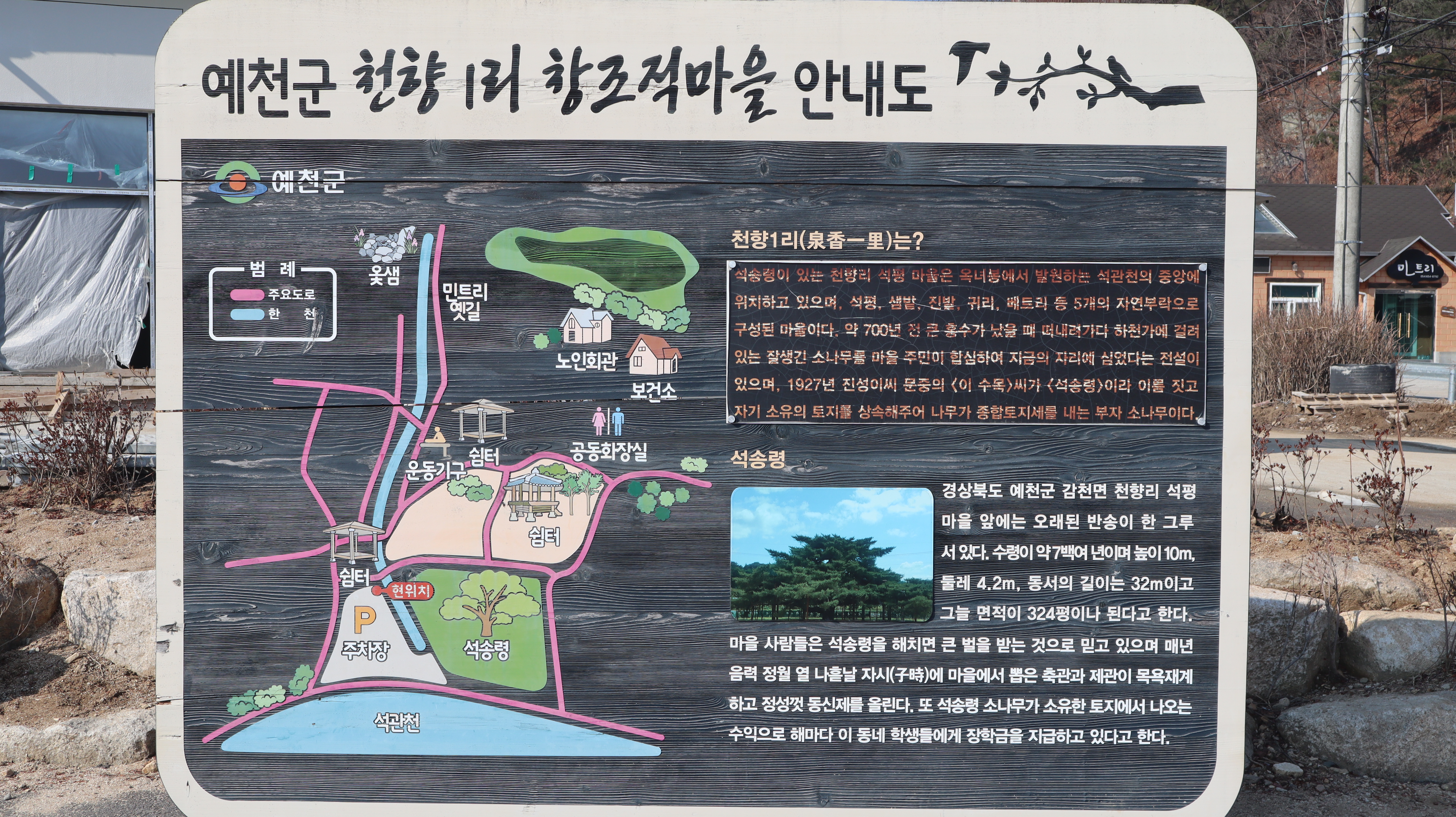 석송령 주차장에 주차를 한 후 바로 옆으로 이동하면 석송령을 만나볼 수 있는데요. 사시사철 한결같은 모습을 보여주는 석송령이라서 볼 때 마다 신비롭고 새로운 느낌을 줍니다. 주차장쪽에는 예천군 관광안내지도와 함께 예천군 천향1리 창조적마을 안내도가 있어서 읽어보면 주변을 이해하는데 도움이 됩니다.