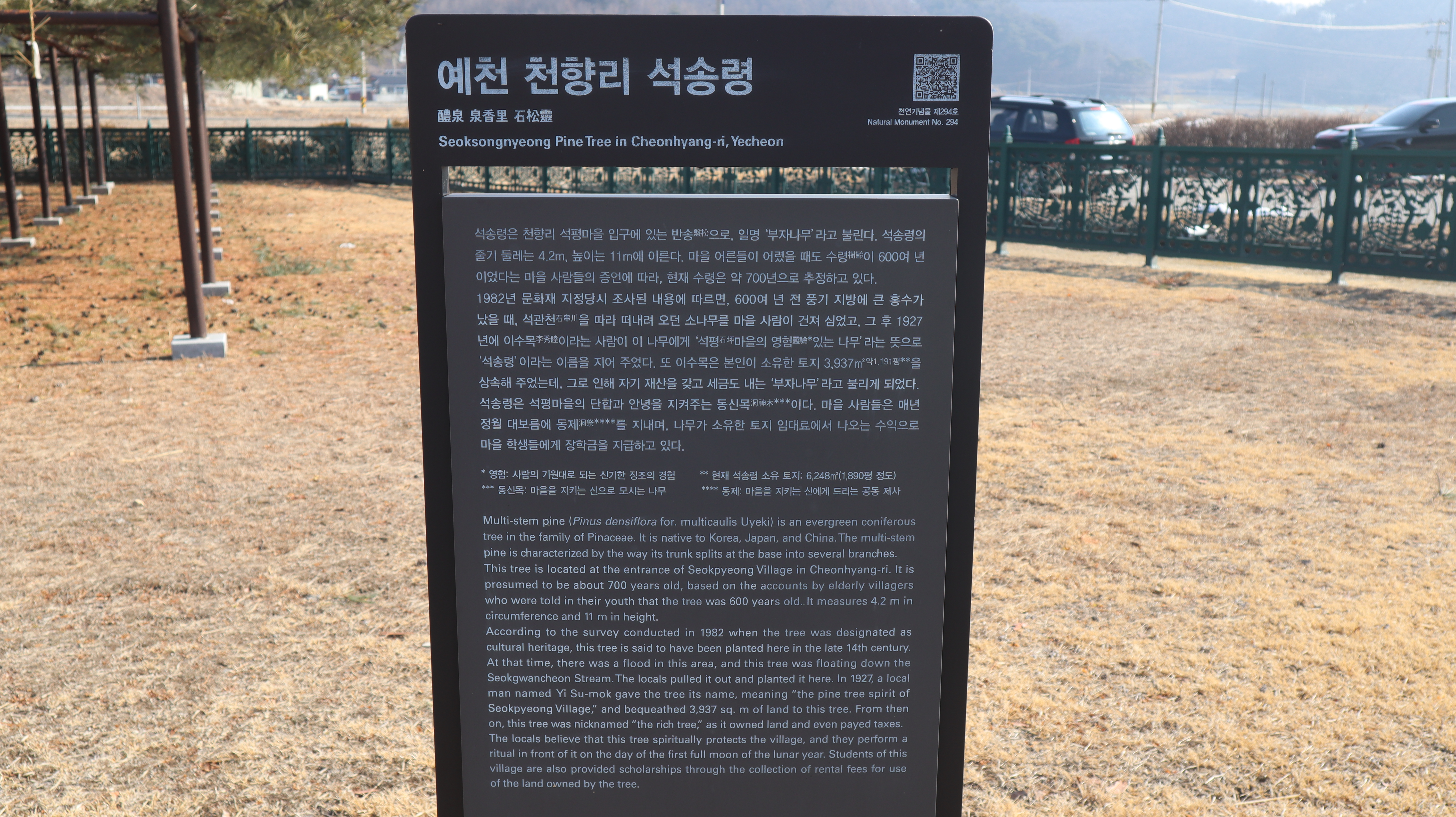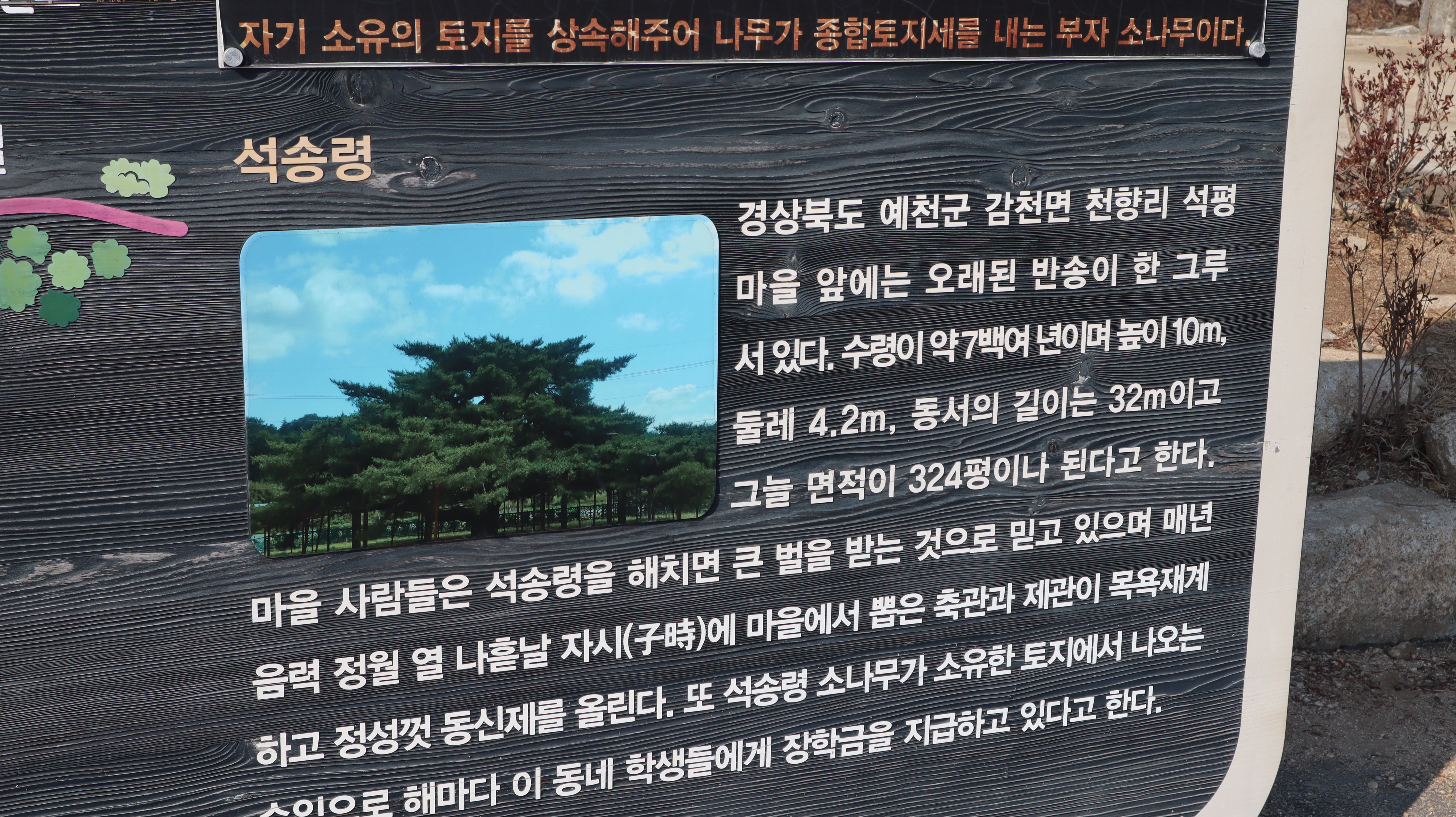 특히 아래쪽에 석송령에 대해 자세한 내용 서령이 있어서 석송령을 처음 방문하시는분들이라면 꼭 한 번 읽어보시면 좋습니다. 자기 소유의 토지를 상속해주어서 나무가 종합토지세를 내는 부자 소나무라고 합니다.