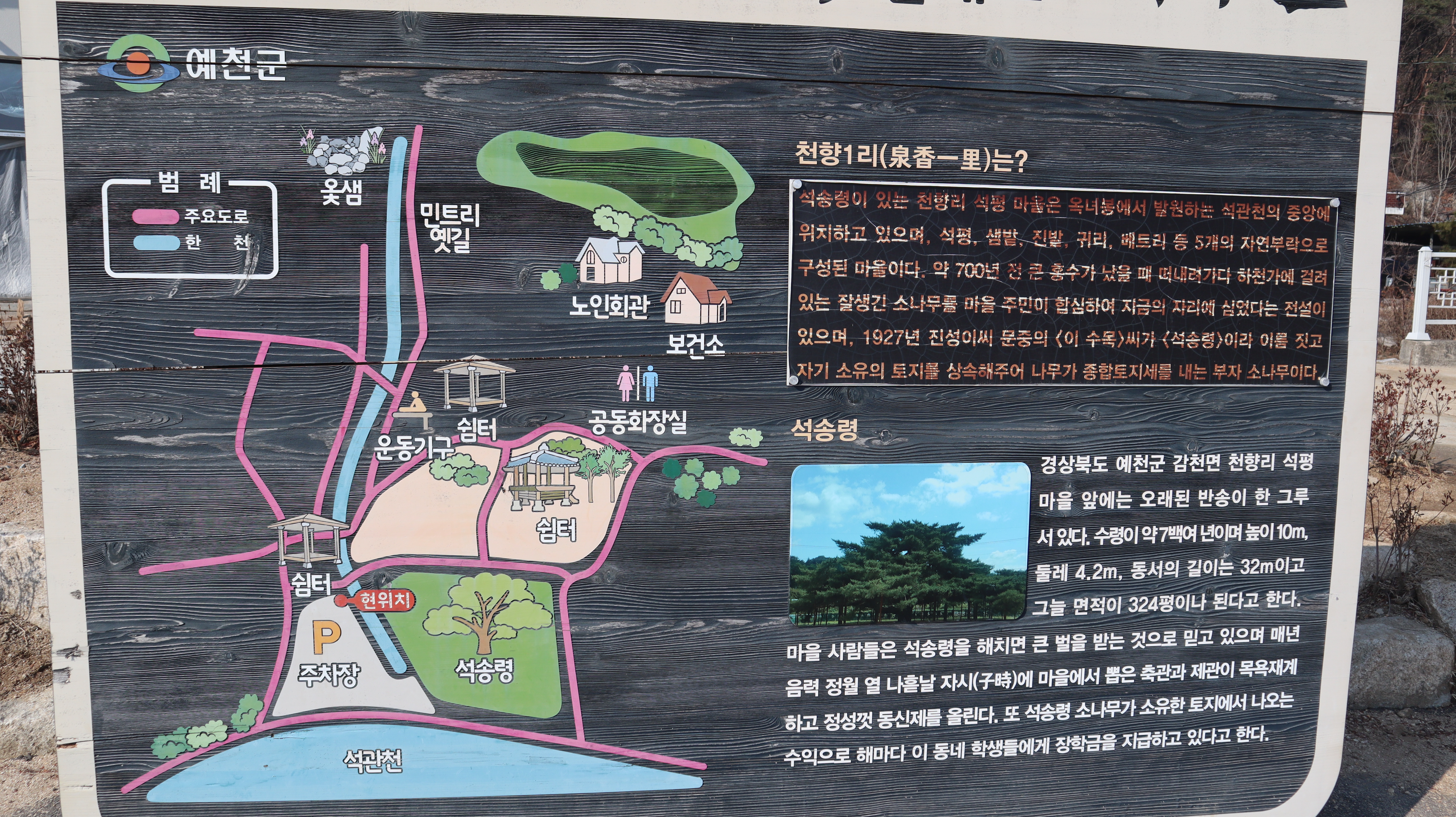 석송령 주차장에 주차를 한 후 바로 옆으로 이동하면 석송령을 만나볼 수 있는데요. 사시사철 한결같은 모습을 보여주는 석송령이라서 볼 때 마다 신비롭고 새로운 느낌을 줍니다. 주차장쪽에는 예천군 관광안내지도와 함께 예천군 천향1리 창조적마을 안내도가 있어서 읽어보면 주변을 이해하는데 도움이 됩니다.