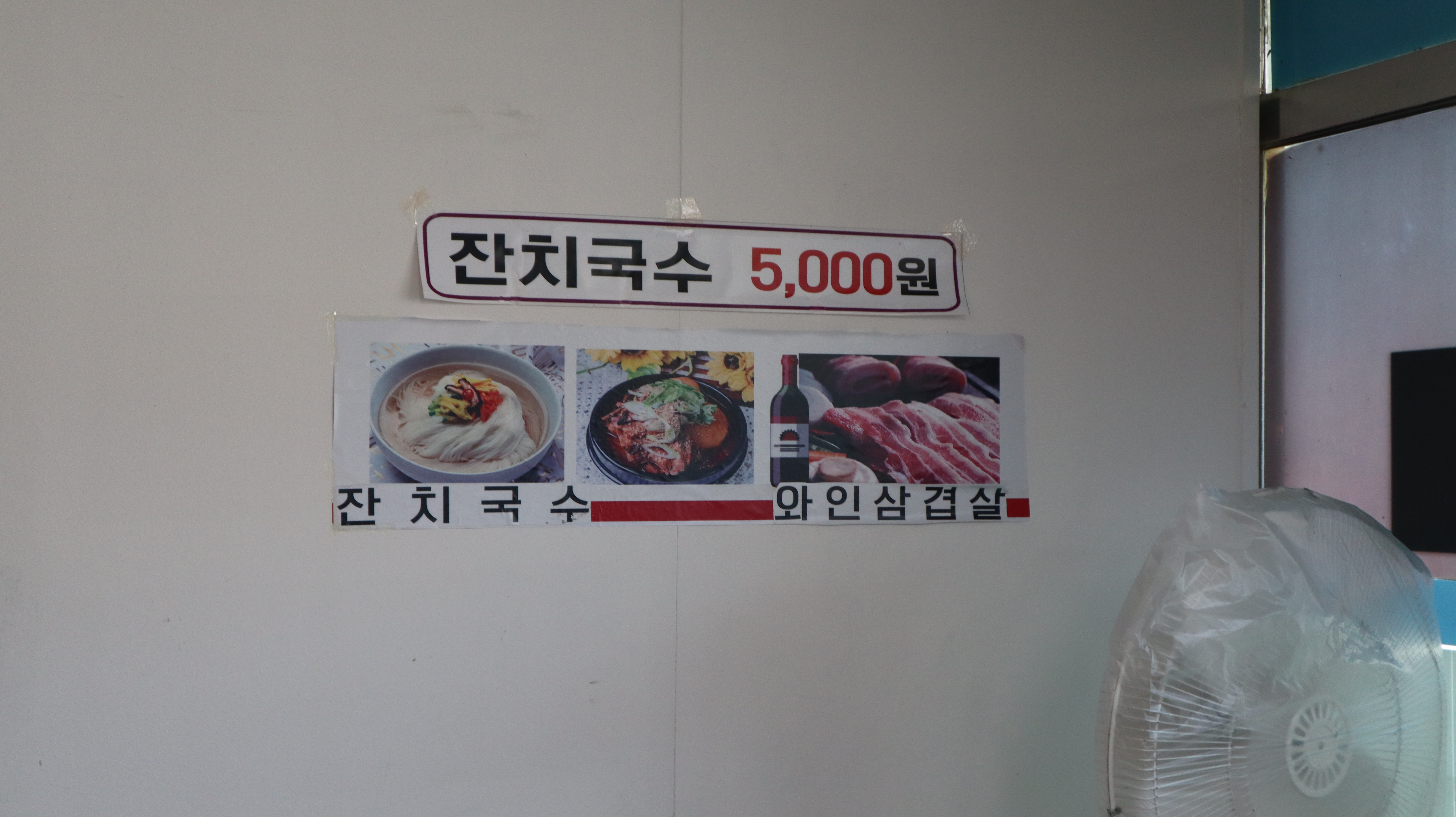 식당 외부에서 메뉴판 볼 수 있는데 잔치국수 5000원입니다. 작년에도 5000원이었는데 올해도 5000원이네요. 개인적으로 좋아하는 메뉴입니다. 잔치국수외에도 소머리국밥이나 김치찌개, 순두부, 묵밥 등 다양한 식사류를 판매 중입니다.