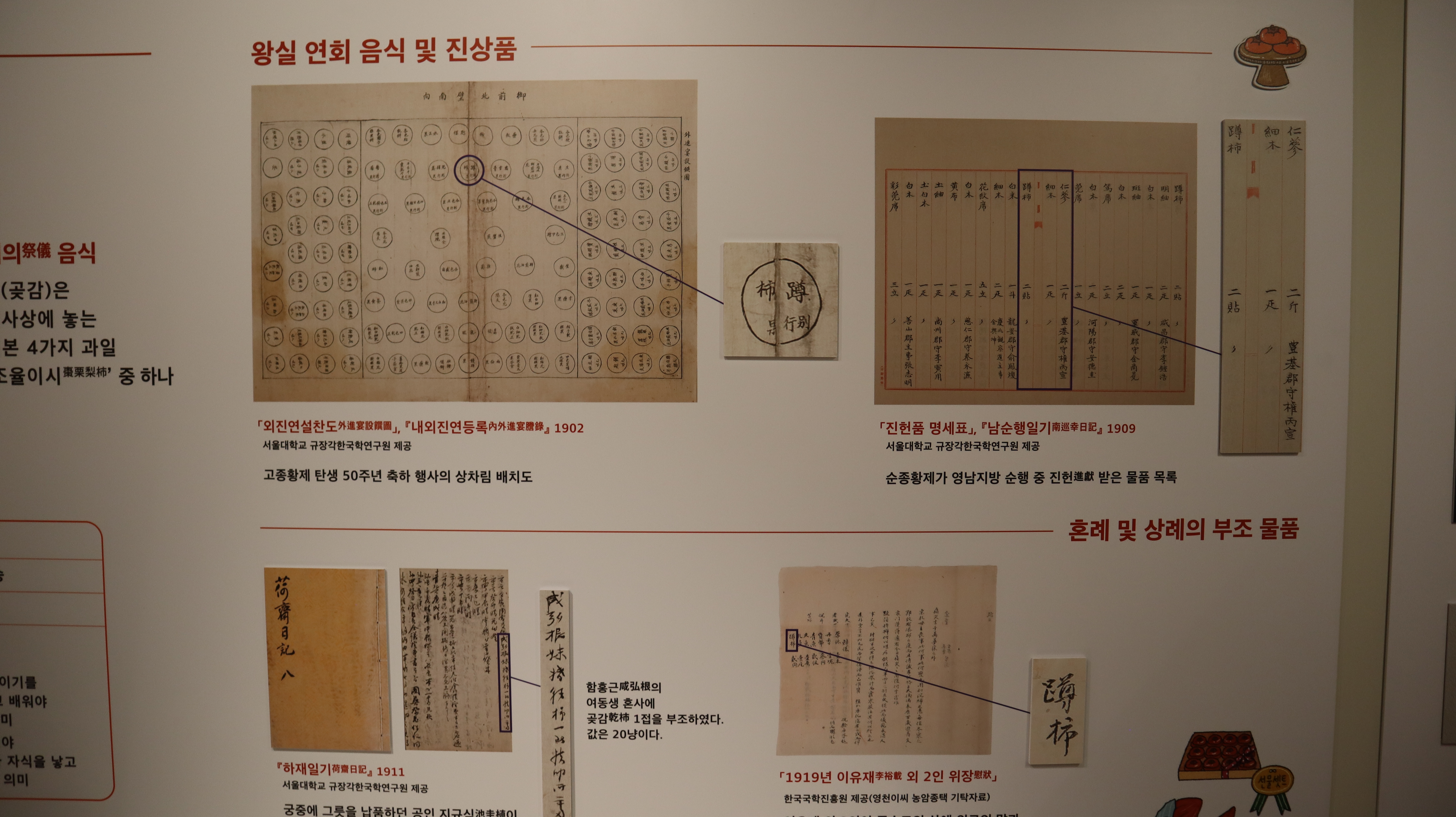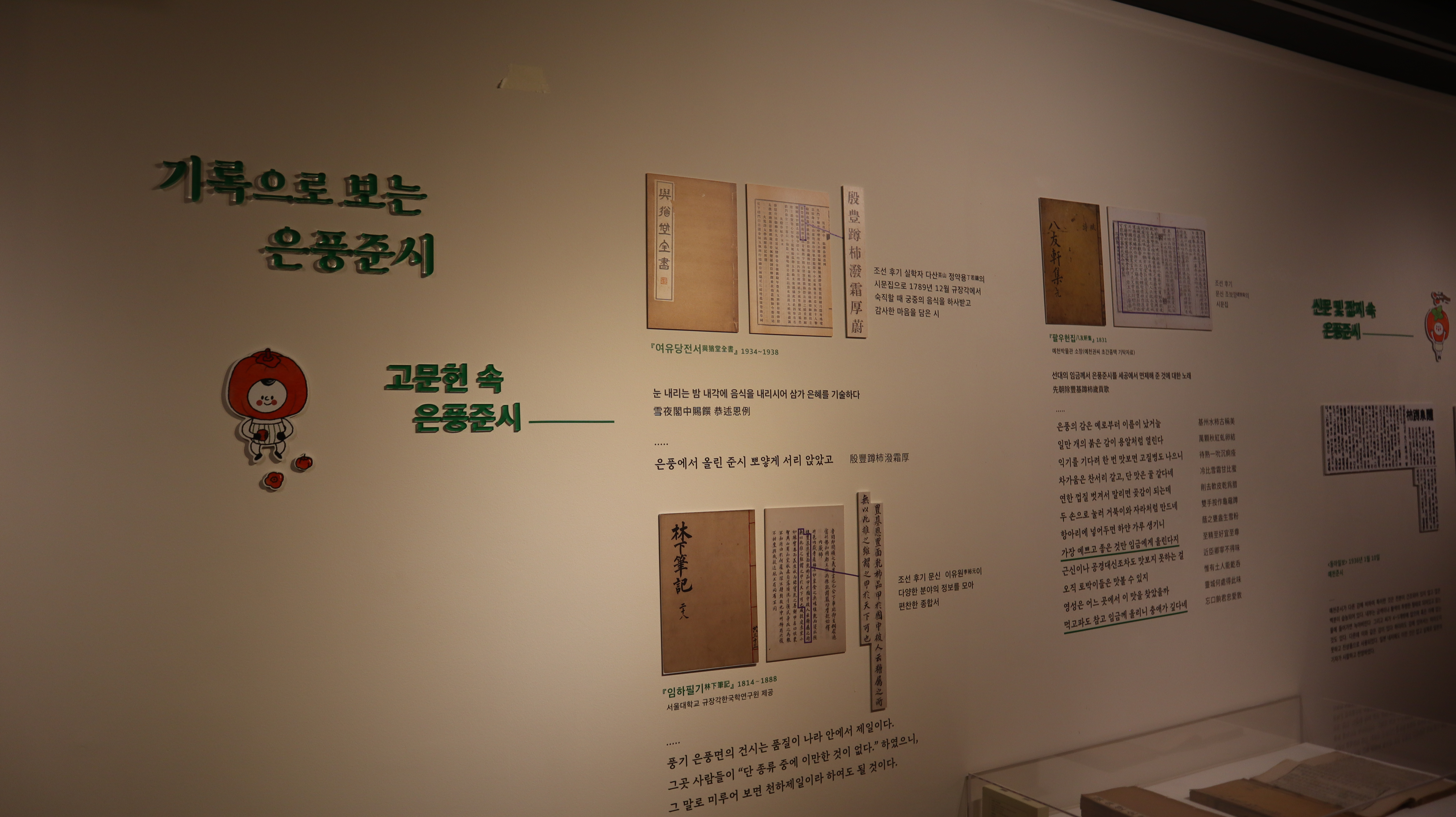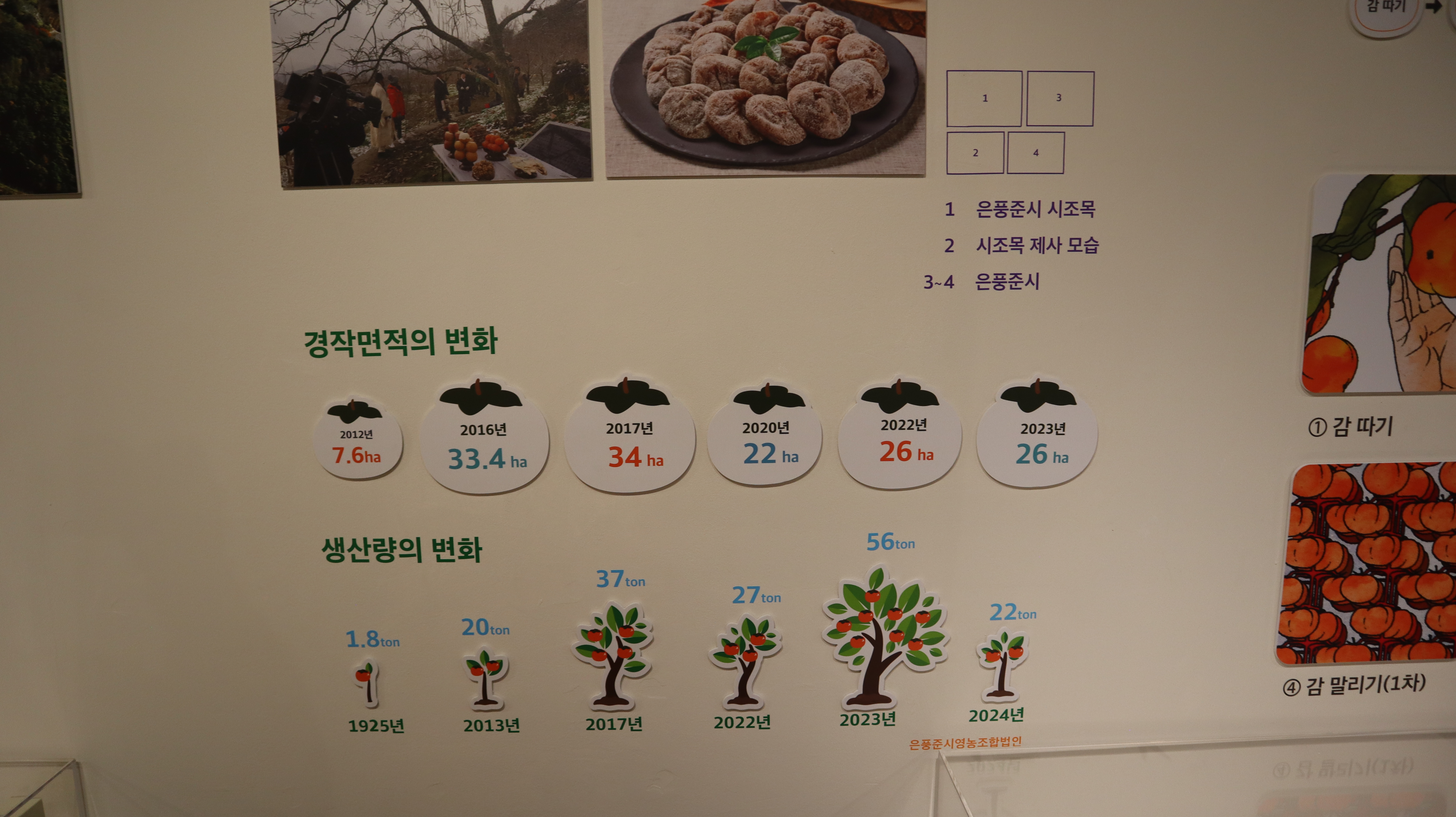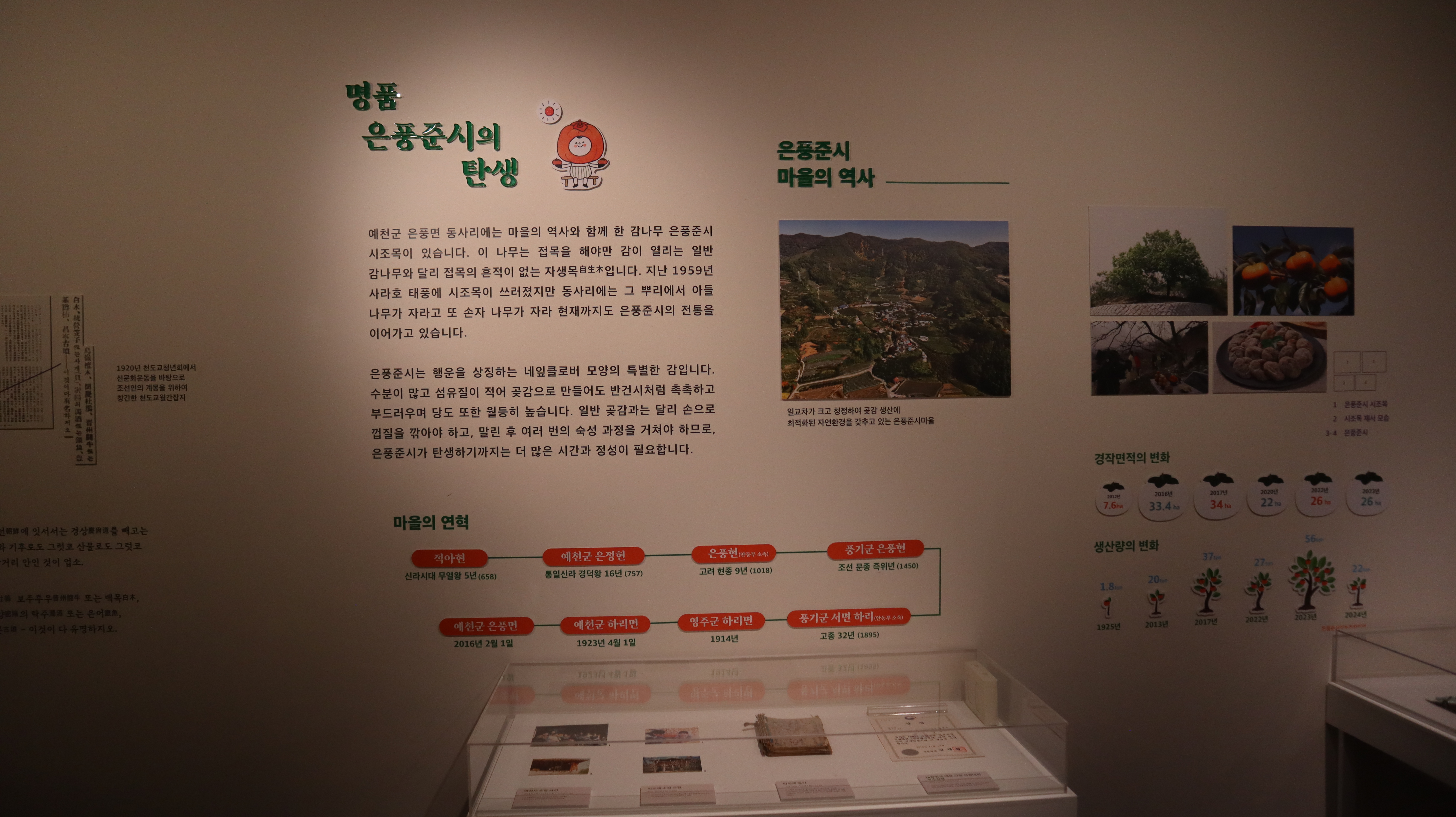 은풍준시의 역사와 감에 대한 스토리를 알아보는 코너가 참 인상깊었어요. 조선시대 임금님께 진상되었던 기록부터, 일제강점기와 한국전쟁을 거치며 어려움을 겪었던 이야기까지, 은풍준시가 걸어온 파란만장한 역사를 한눈에 볼 수 있었습니다. 특히, 옛 문헌에 기록된 은풍준시의 모습과 관련된 유물들도 기억에 남습니다.