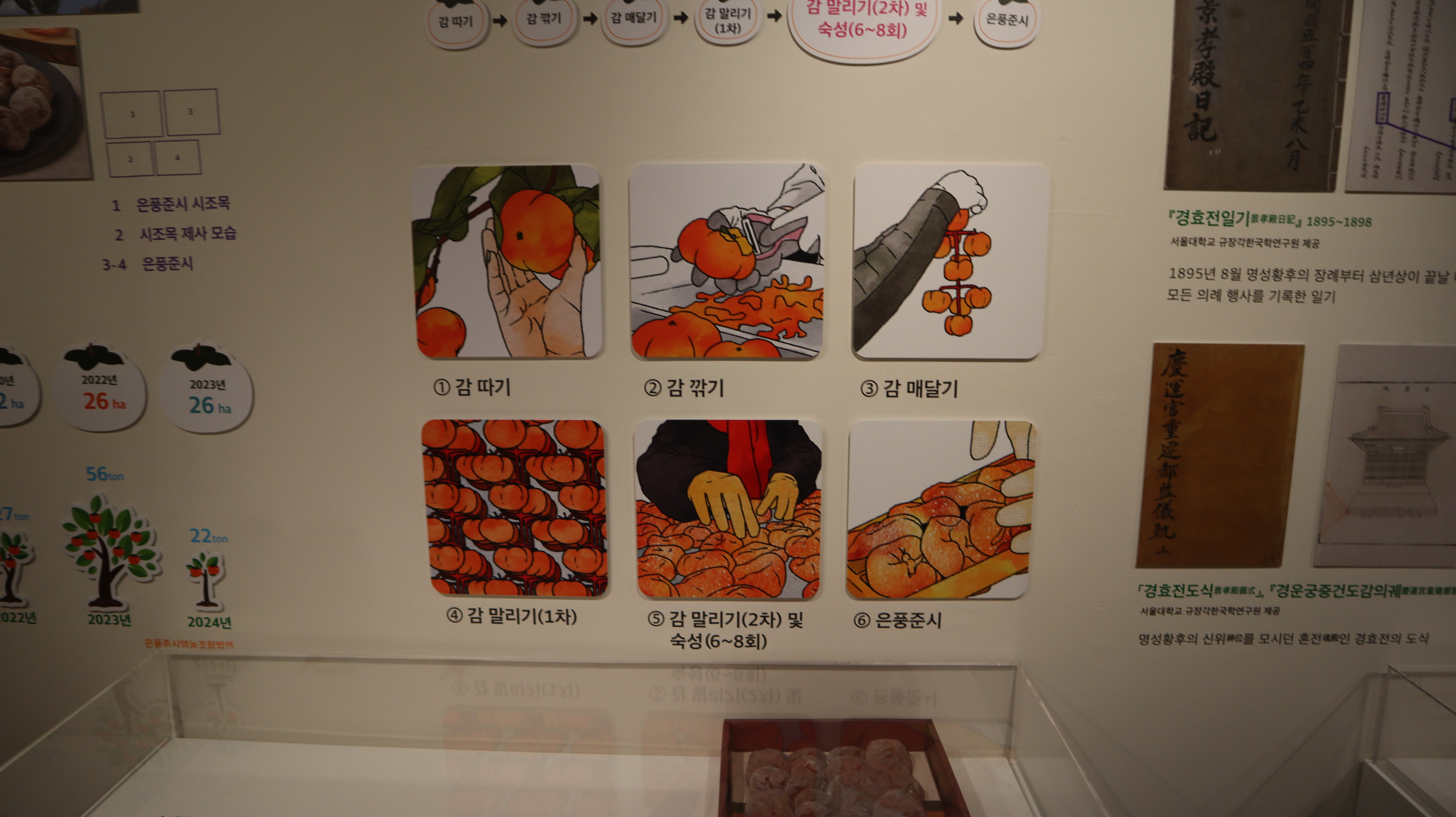다정자감 은풍준시 기획전시실에서 예천에서 생산되는 곶감에 대한 역사와 가치, 그리고 전통을 지켜온 사람들의 이야기를 확인할 수 있었어요. 알면 알수록 특별한 은풍준시 곶감. 은풍준시 전시가 예천박물관 기획전시실에서 2025년 1월부터 4월말까지 진행되니 한 번 방문해보시는걸 추천합니다.
