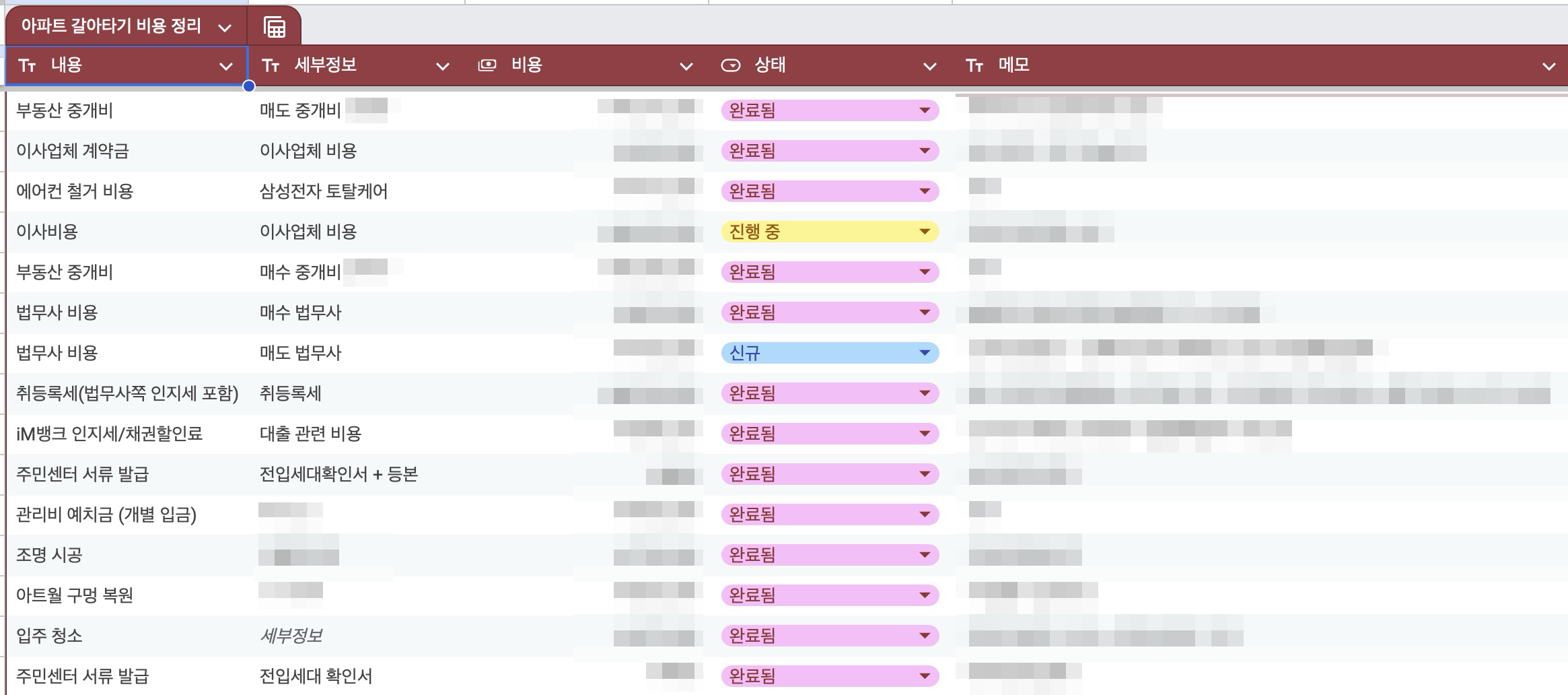 다음으로 유용했던 방법은 구글 스프레드시트에 아파트 갈아타기 과정에 필요한 비용들을 프로젝트 단위로 추적하고 정리할 수 있도록 해둔 것이었는데 큰 도움이 되었다. 예를들어 짧은 기간동안 비용이 여기저기에서 나갔다 들어갔다 막 하다보니까 나중에는 엄청 헷갈리고, 여기 업체에 예약금을 넣었는지 아닌지조차 헷갈려가지고 이때에도 시트를 보면서 찾아보니 확실했다.