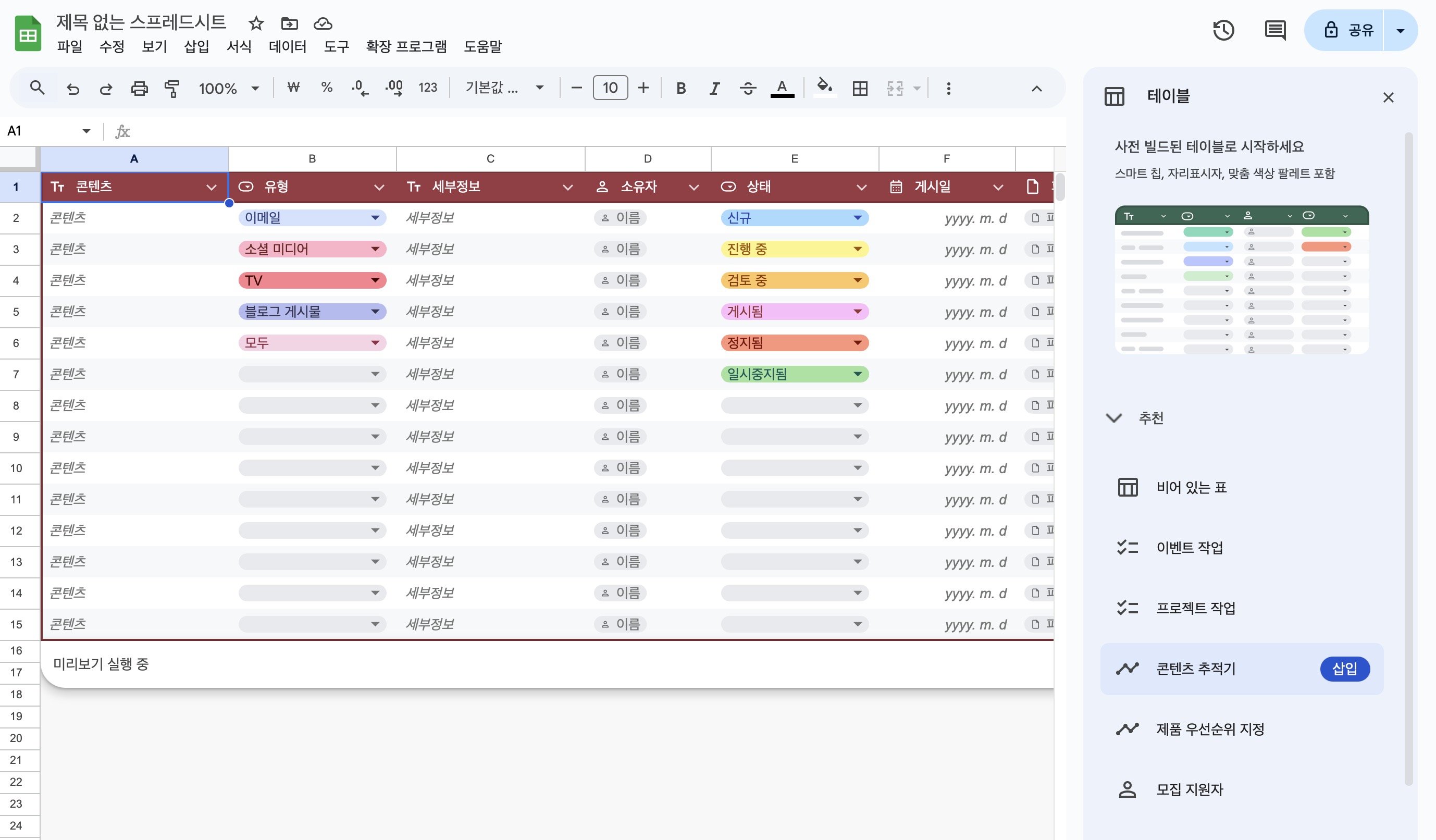위 시트 양식은 구글 스프레드시트에서 빈 프로젝트를 생성한 후 오른쪽에 테이블 추천화면이 나타나면 여기에서 <콘텐츠 추적기>를 선택하면 자동으로 만들 수 있다. (이 양식은 콘텐츠 추적기로만 만들어지고 기본 구글 스프레드시트 템플릿 갤러리에는 없다)