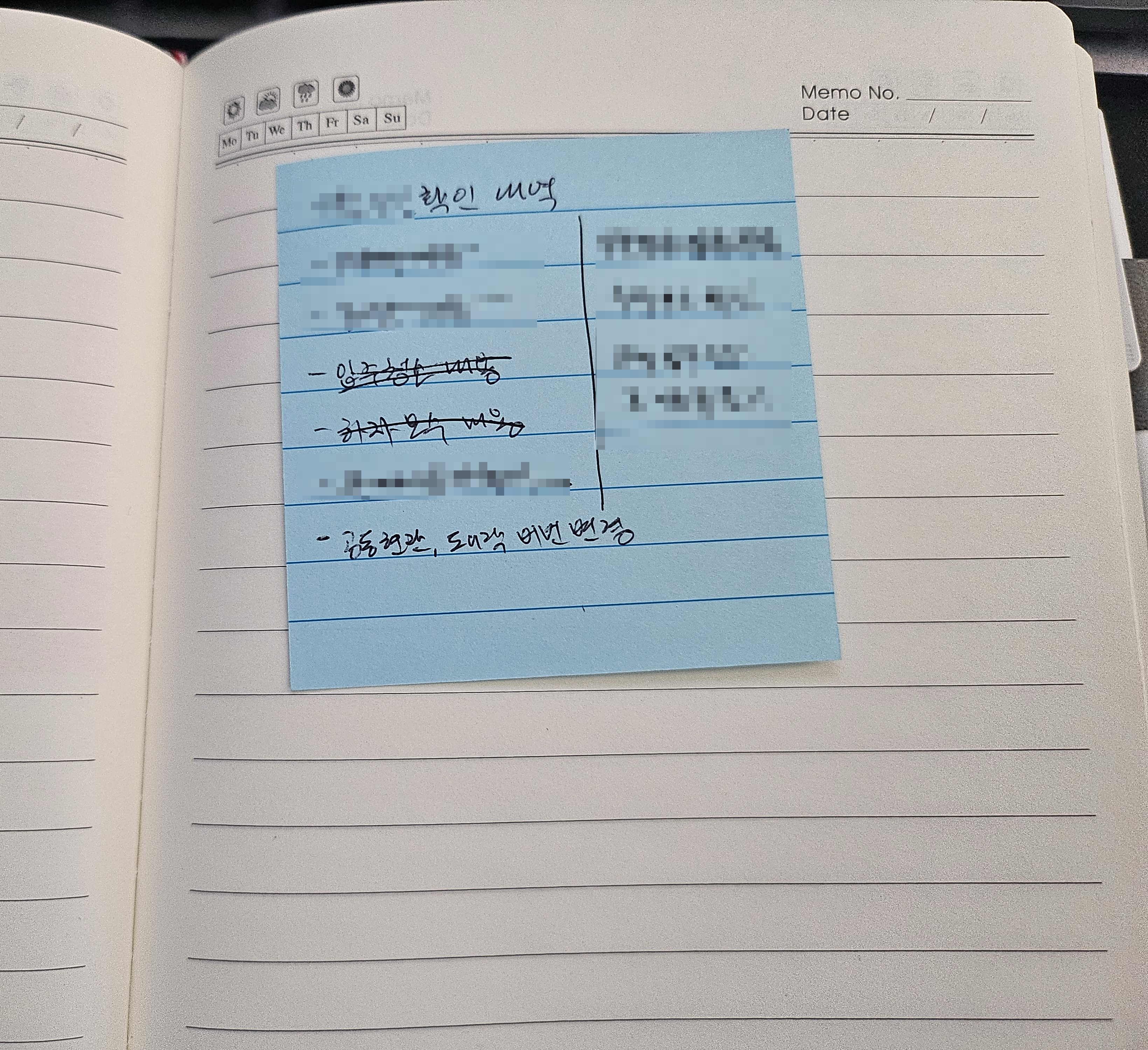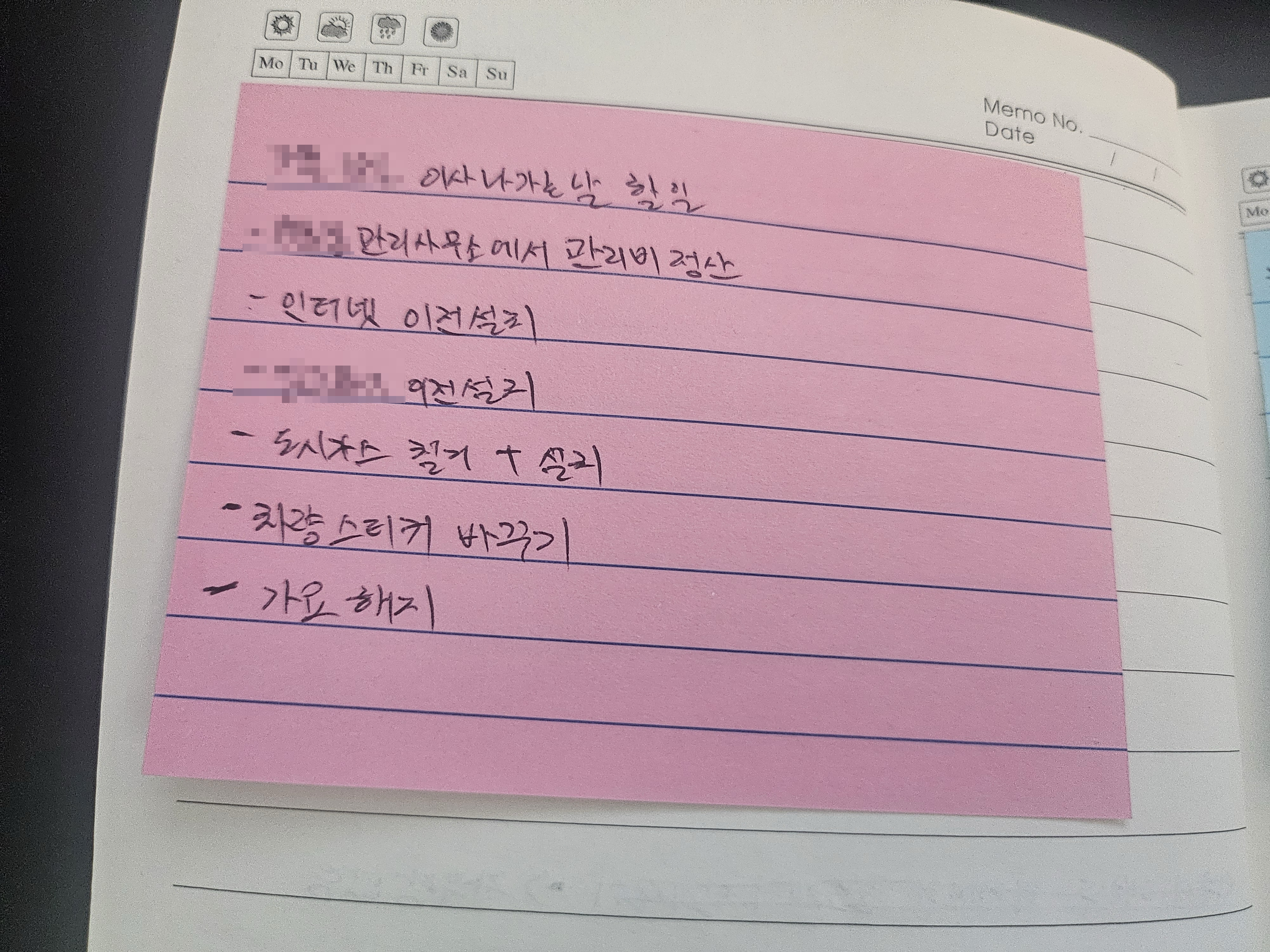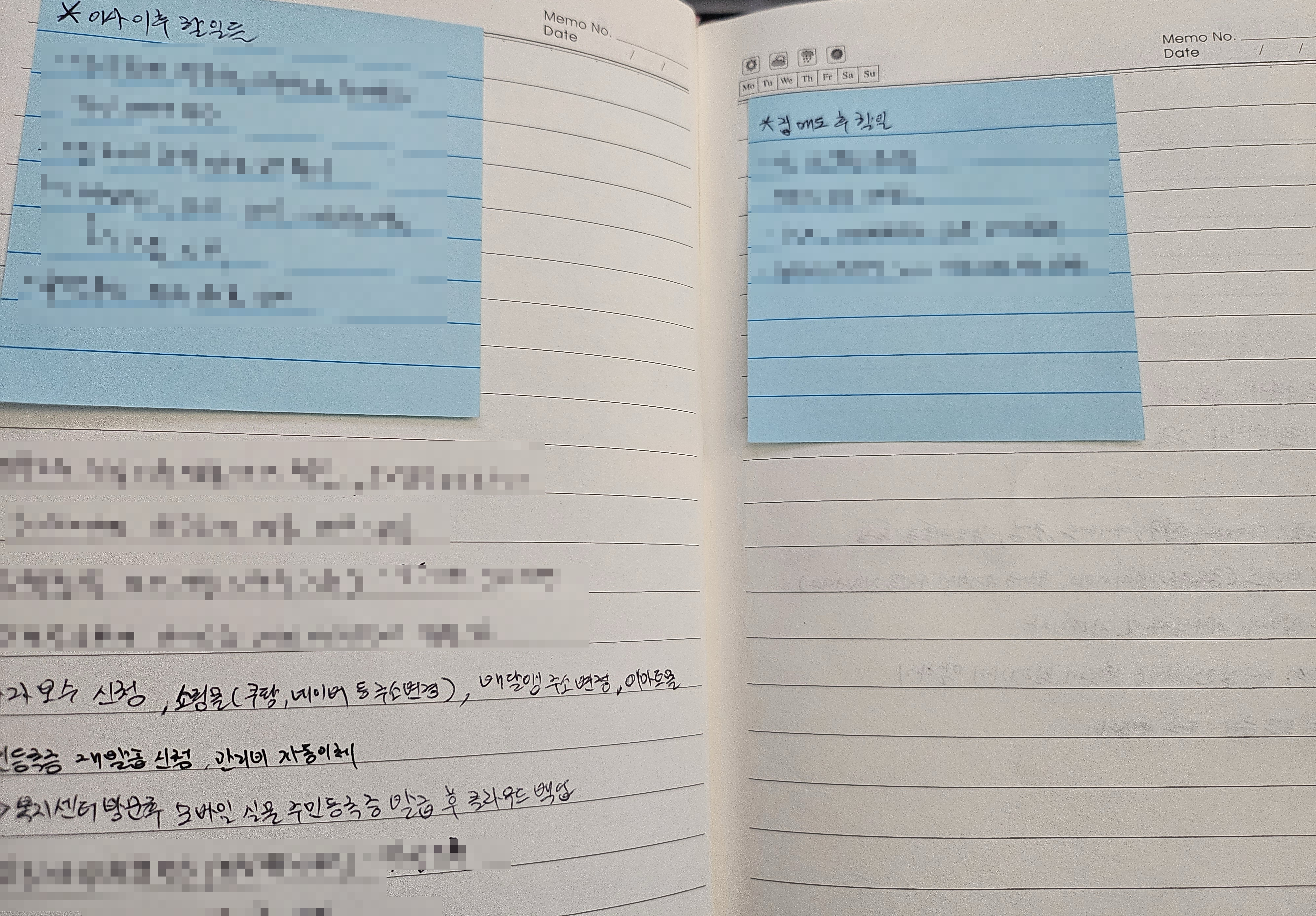 이런식으로 다이어리에 매도일에 할 일, 매수일에 할 일, 이사나가는 날 할 일, 그전에 할 일 등을 기록해두고, 시간이 지날 때 마다 가끔 생각나는게 있으면 추가로 적어두어서 되도록이면 일 처리 과정에서 빠지거나 실수로 놓치는 일이 없게끔 해두었다.