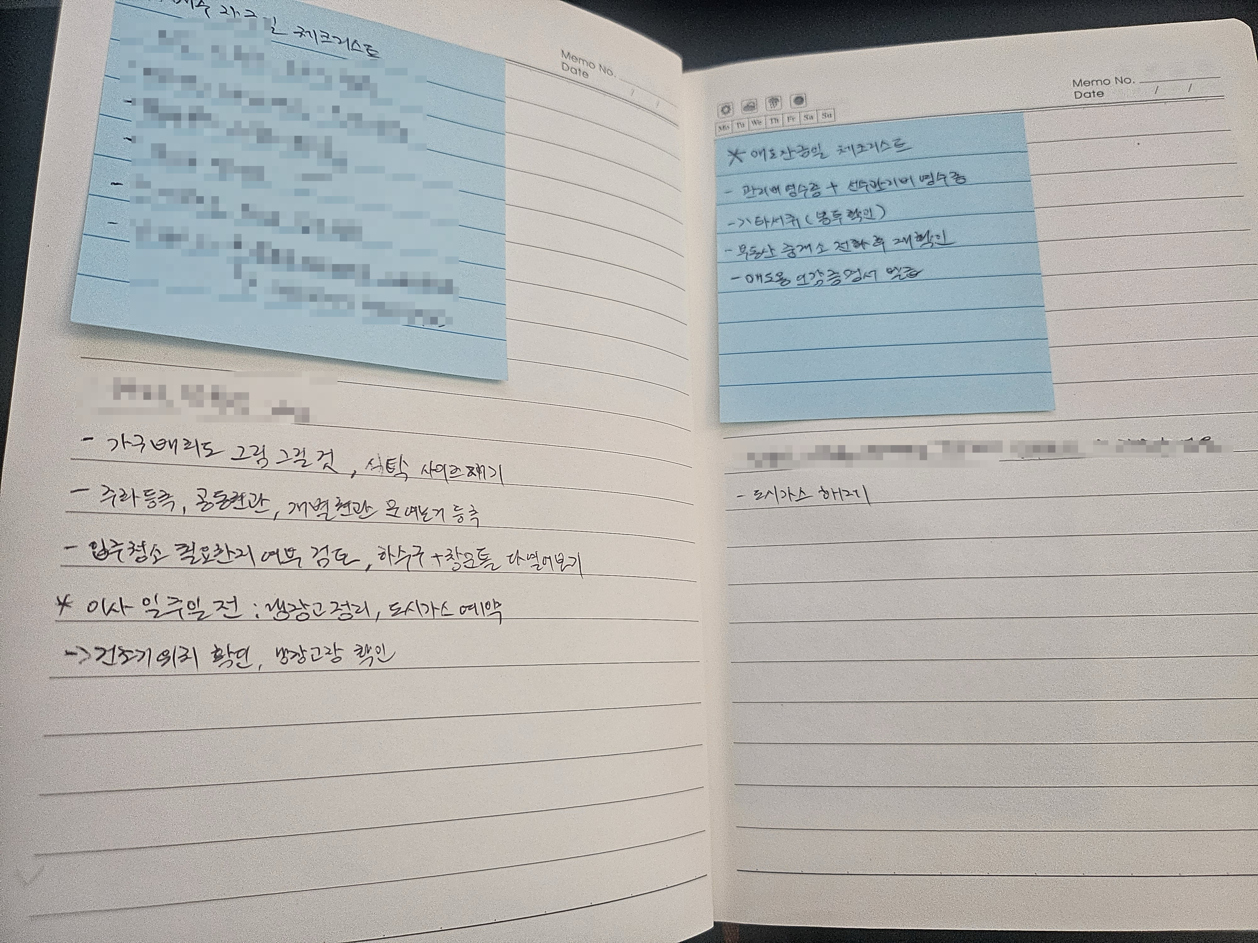 지난번에도 블로그에 포스팅했던적이 있었는데 복잡한 일처리는 나누어서 체크리스트로 만들어서 처리하는걸 선호하는 편이다보니 이번에는 위 사진에서처럼 다이어리 한 권을 따로 준비했다. 들고 다니기 가볍고 펜을 끼울 수 있는 적당한 걸로 준비하고 이걸 이사할 때 생각나는 것들을 정리해서 메모하고, 놓치기 쉬운 것들을 모조리 다 기록해두는걸로 사용하였다.