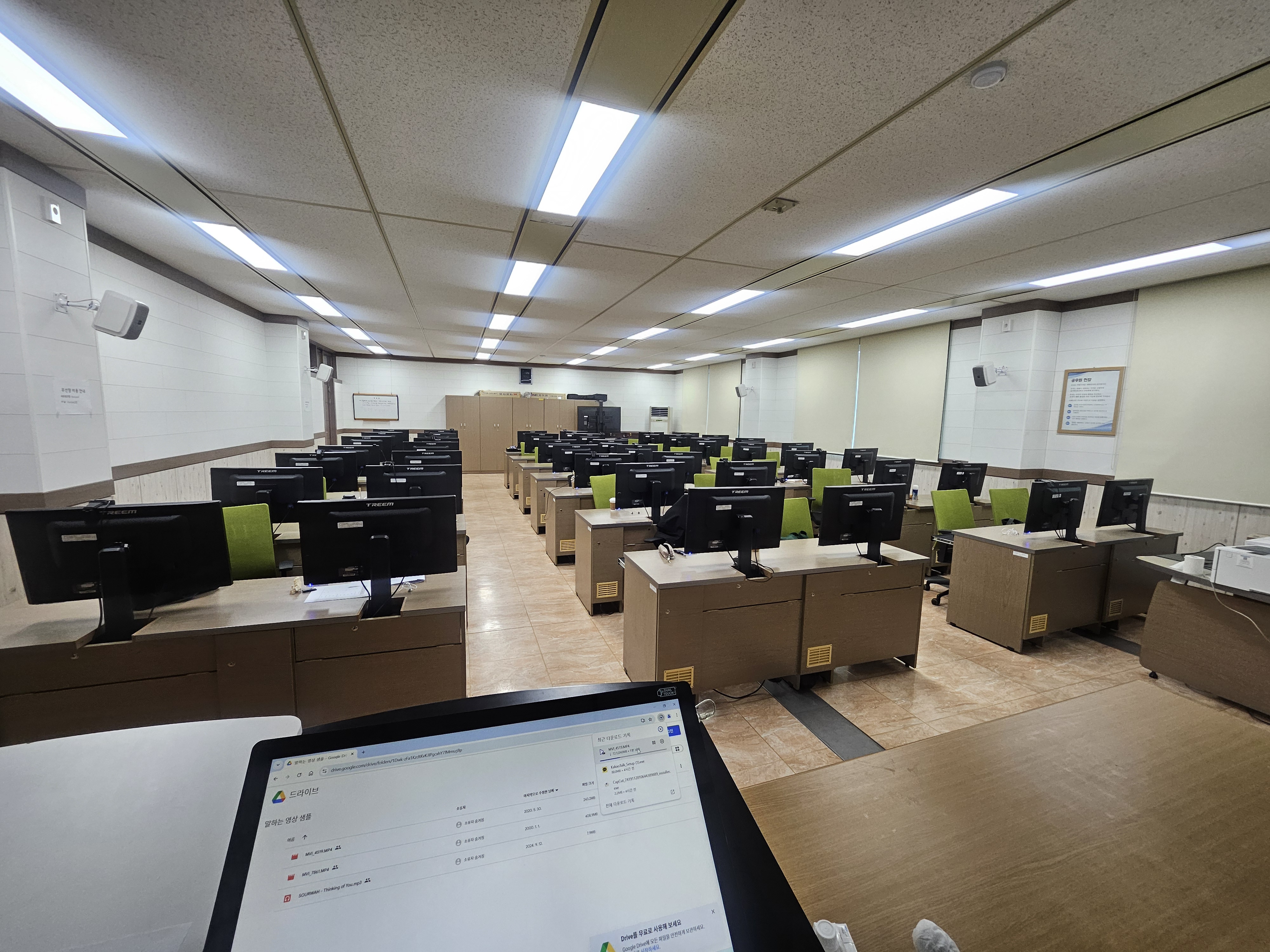 시설이 깔끔하니 괜찮더라고요. 영상 편집 프로그램도 무리없이 잘 작동하였고요. 아쉽게도 외부링크가 보안 문제로 막혀있어서 이메일 같은게 접속이 안되는 그런게 있었는데 유튜브는 접속이 가능했었고, 샌드애니웨어를 접속할 수 없었어서 PC버전 카톡을 이용해가지고 데이터를 주고받는걸로 강의 진행하였습니다.