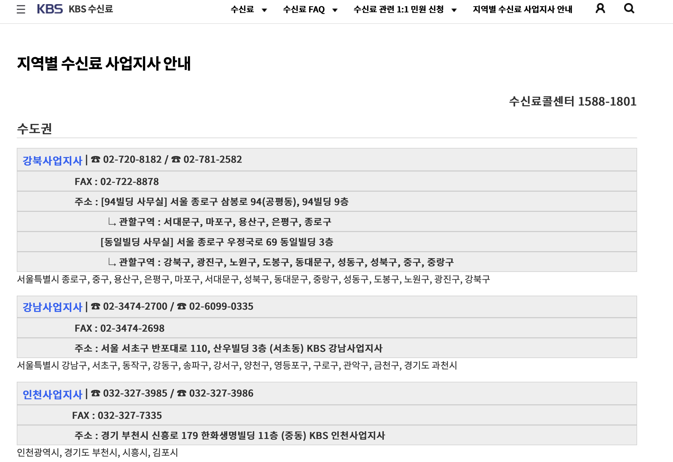 KBS 홈페이지에서 사업지사 전화번호 목록을 볼 수 있다.