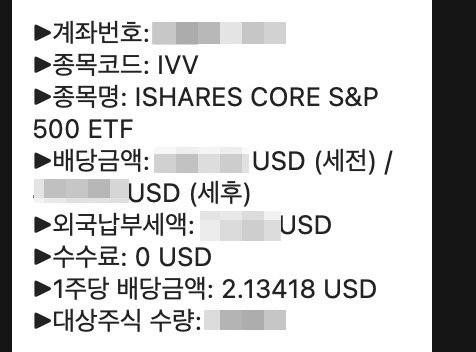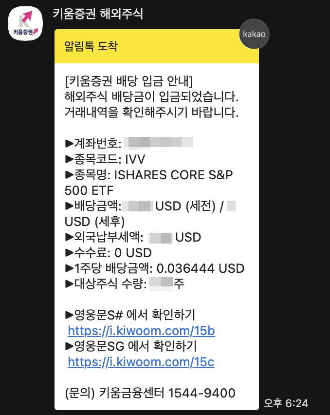 어제 카톡으로 키움증권 알림톡이 와서 보니 IVV 배당금이 들어왔다는 소식이었다. 나는 지금까지는 S&P 500 ETF를 투자할 때 IVV로만 매수해왔기 때문에 IVV 종목으로 가져가고 있고 키움증권에서 투자하고 있다. (올해 중순쯤 다른 증권사로 주식 실물이전 계획중이다. 선입선출과 이동평균법 계산 방식 때문인데 자세한건 아래 글 참고)