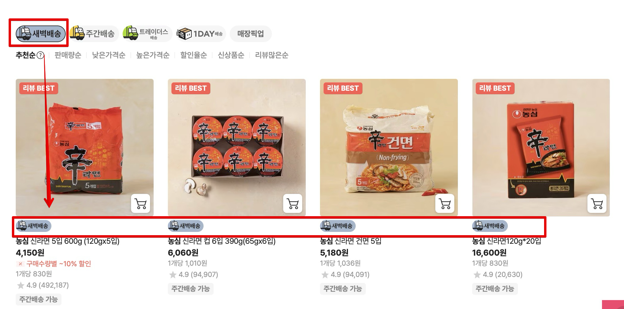 나는 보통 상품을 검색해서 꼭 살것만 사는걸 좋아하기 때문에 상품을 검색해서 찾은 후 위에 나타나는 버튼들 중에서 <새벽배송>을 클릭하면 새벽배송이 가능한 상품들만 모아서 볼 수 있고 새벽배송 태그도 직관적으로 확인이 가능하다. 개인적으로 이 방법을 선호한다.