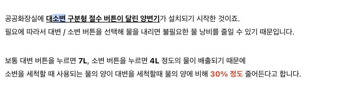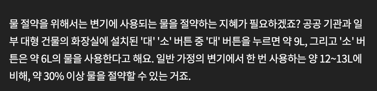뉴스 기사를 찾아보니 대소버튼 중 소 버튼을 이용하면 물을 약 30% 정도 절약할 수 있다고 한다. 그래서 소변만 볼 때에는 소 버튼을 이용하는게 물절약에도 도움이 될 것 같다.