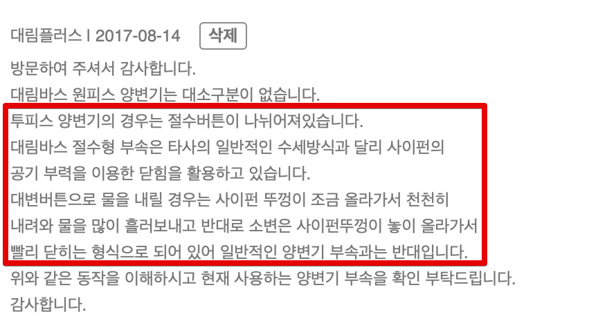 대림바스 질문하는 고객센터 글쪽에서 찾아보니 2017년에 이런 글이 있어서 읽어보게 되었다. 대림바스 양변기의 경우 절수버튼이 있을 경우 사이펀의 공기 부력을 이용해서 닫힘을 활용한다고 한다.