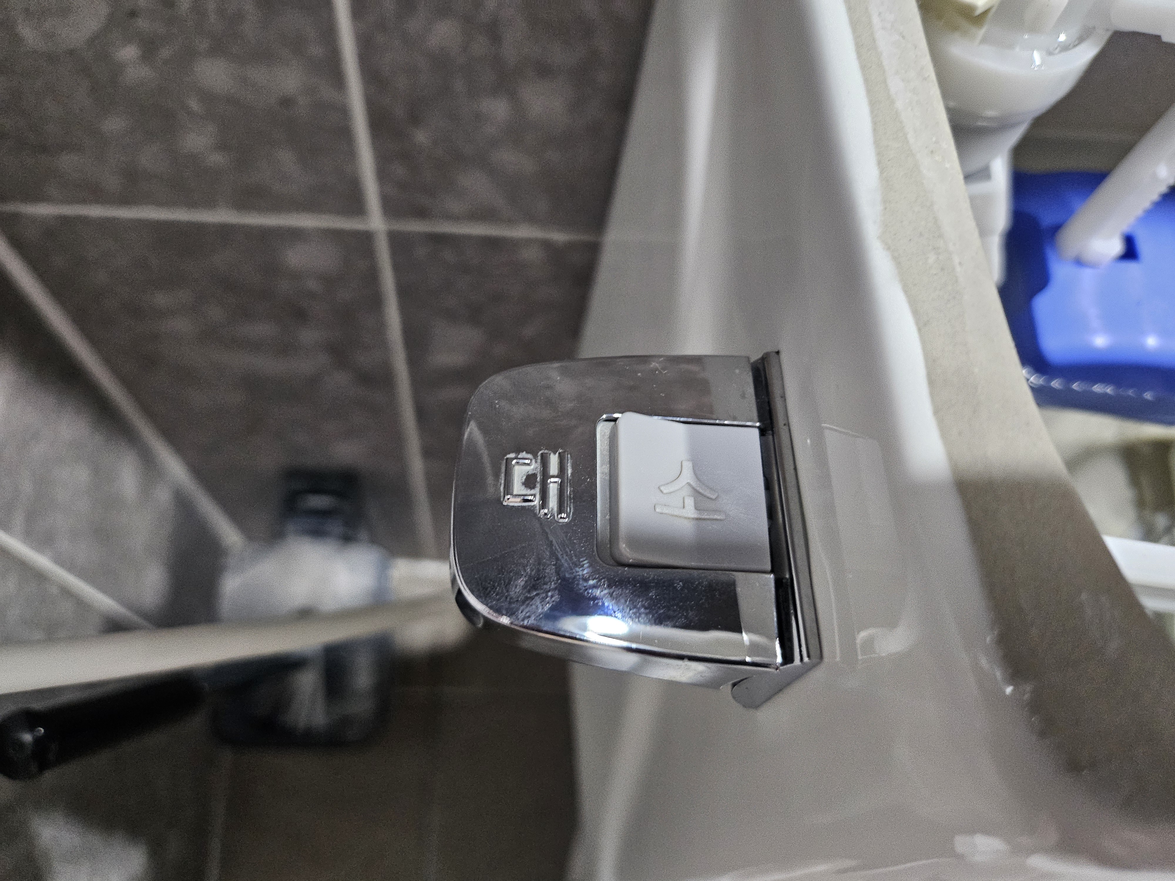 양변기 뒤에 있는 뚜껑을 열어두고 대 버튼과 소 버튼을 번갈아 눌러보면서 테스트를 해보았다. 소변 버튼의 경우 소 버튼을 짧게 눌러주면 작동하고 대 버튼은 그냥 원래대로 쓰는 방식이다.
