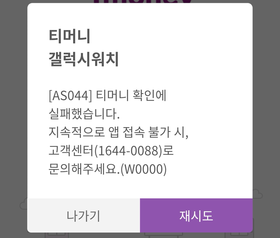 폰에서 티머니 갤럭시워치 앱도 깔고, 워치에서도 티머니 앱 다 깔고 시도하였는데 계속해서 AS044 티머니 확인에 실패했습니다.라는 메시지가 나오면서 앱 접속이 안되었다.