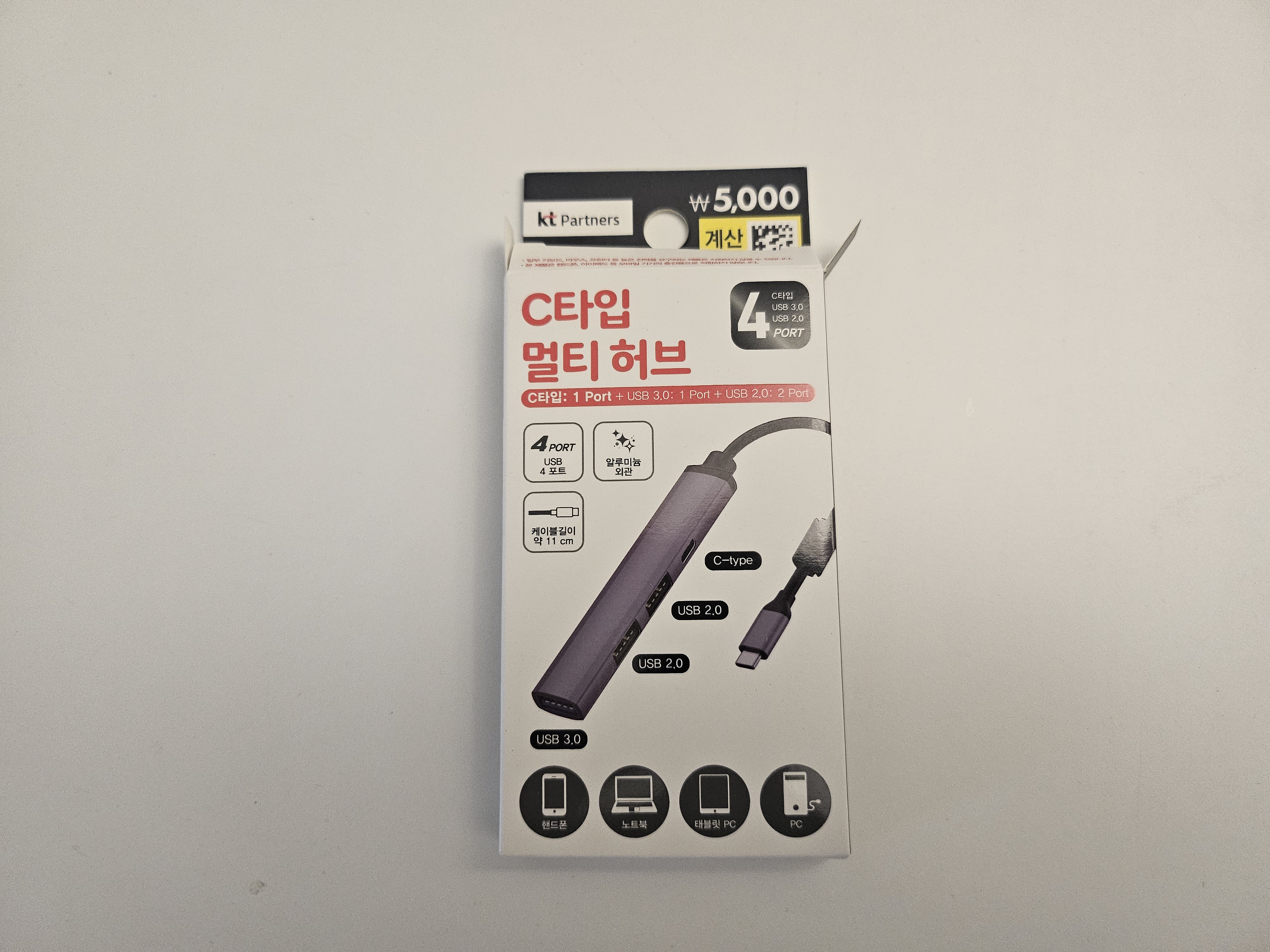 다이소에서 뭐 살거 없나... 둘러보다가 C타입 멀티허브가 있는데 KT파트너스가 돼 있고 가격이 5천원으로 괜찮길래 한 번 구매해보았다. 디자인도 깔끔한게 괜찮고 특히 맥북 디자인에 잘 어울리도록 색상이 들어가 있는 것 같다.