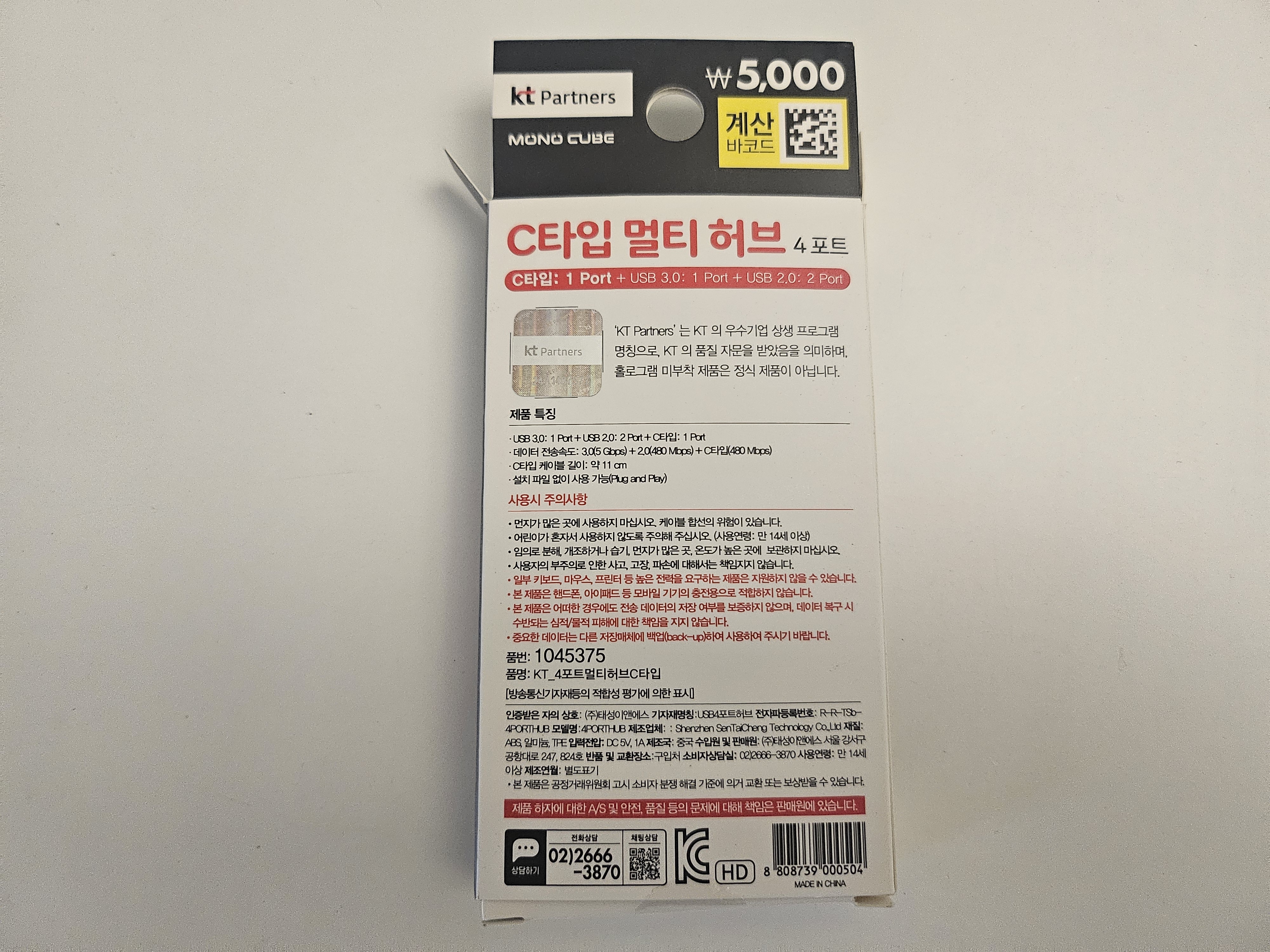 다이소에서 뭐 살거 없나... 둘러보다가 C타입 멀티허브가 있는데 KT파트너스가 돼 있고 가격이 5천원으로 괜찮길래 한 번 구매해보았다. 디자인도 깔끔한게 괜찮고 특히 맥북 디자인에 잘 어울리도록 색상이 들어가 있는 것 같다.