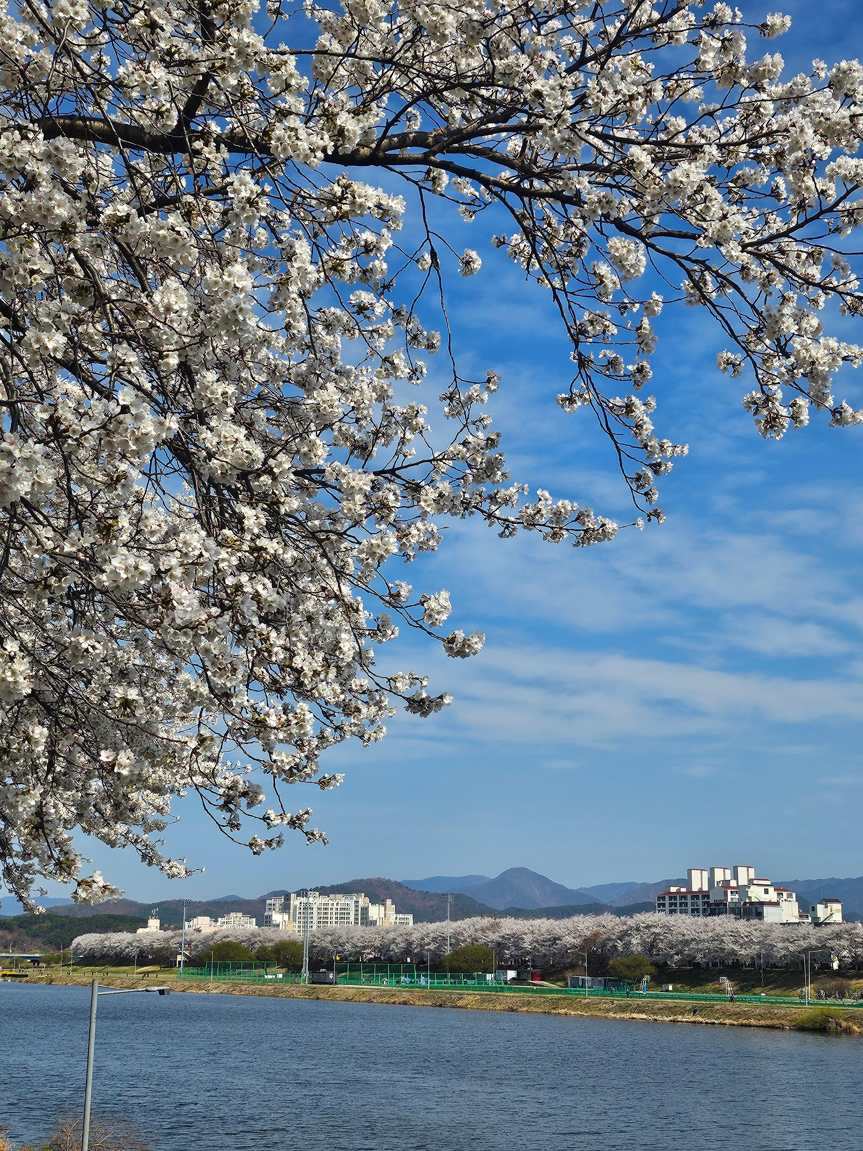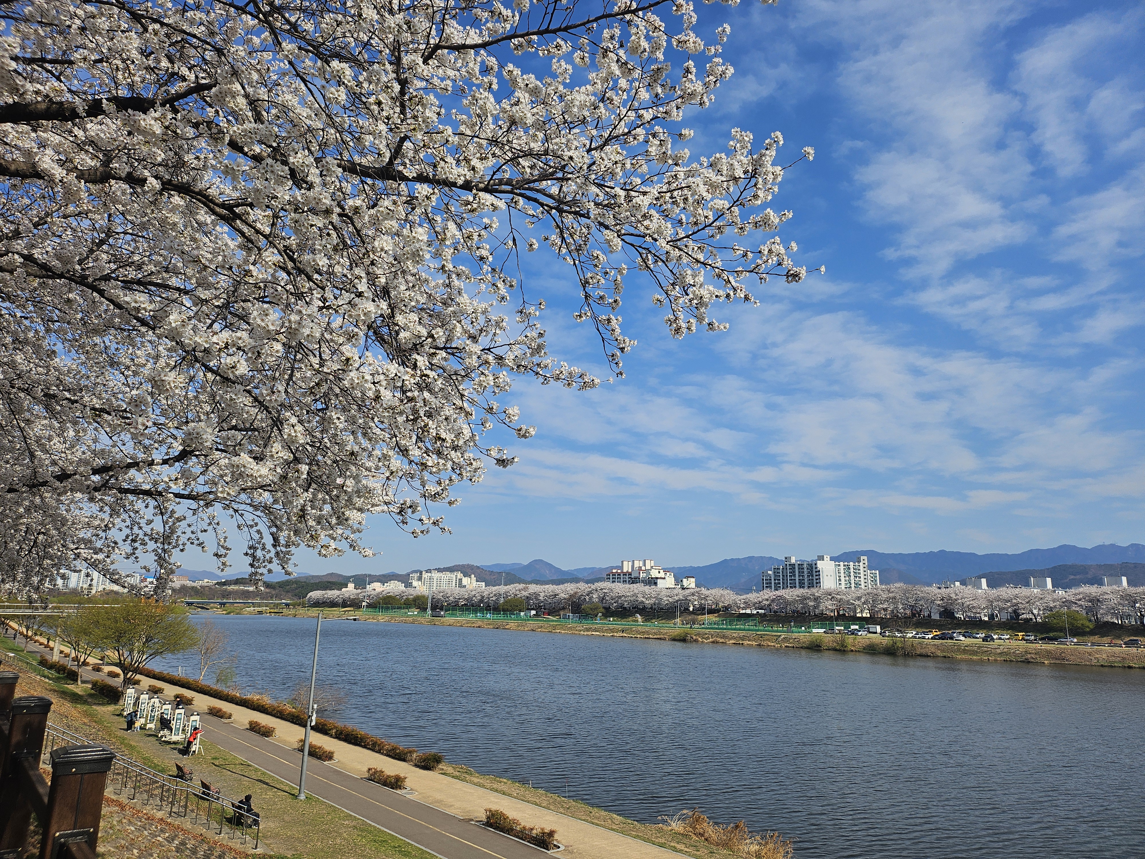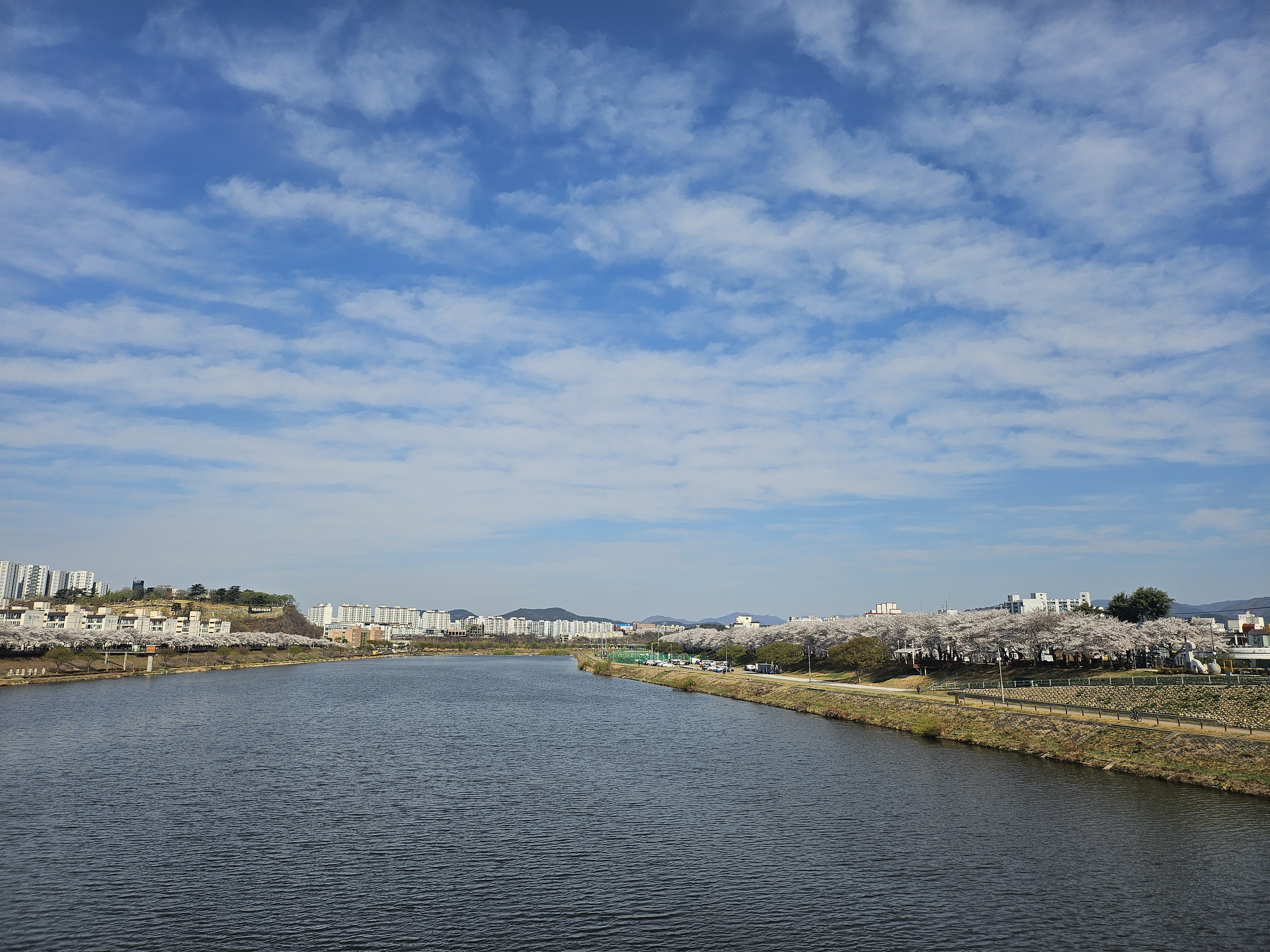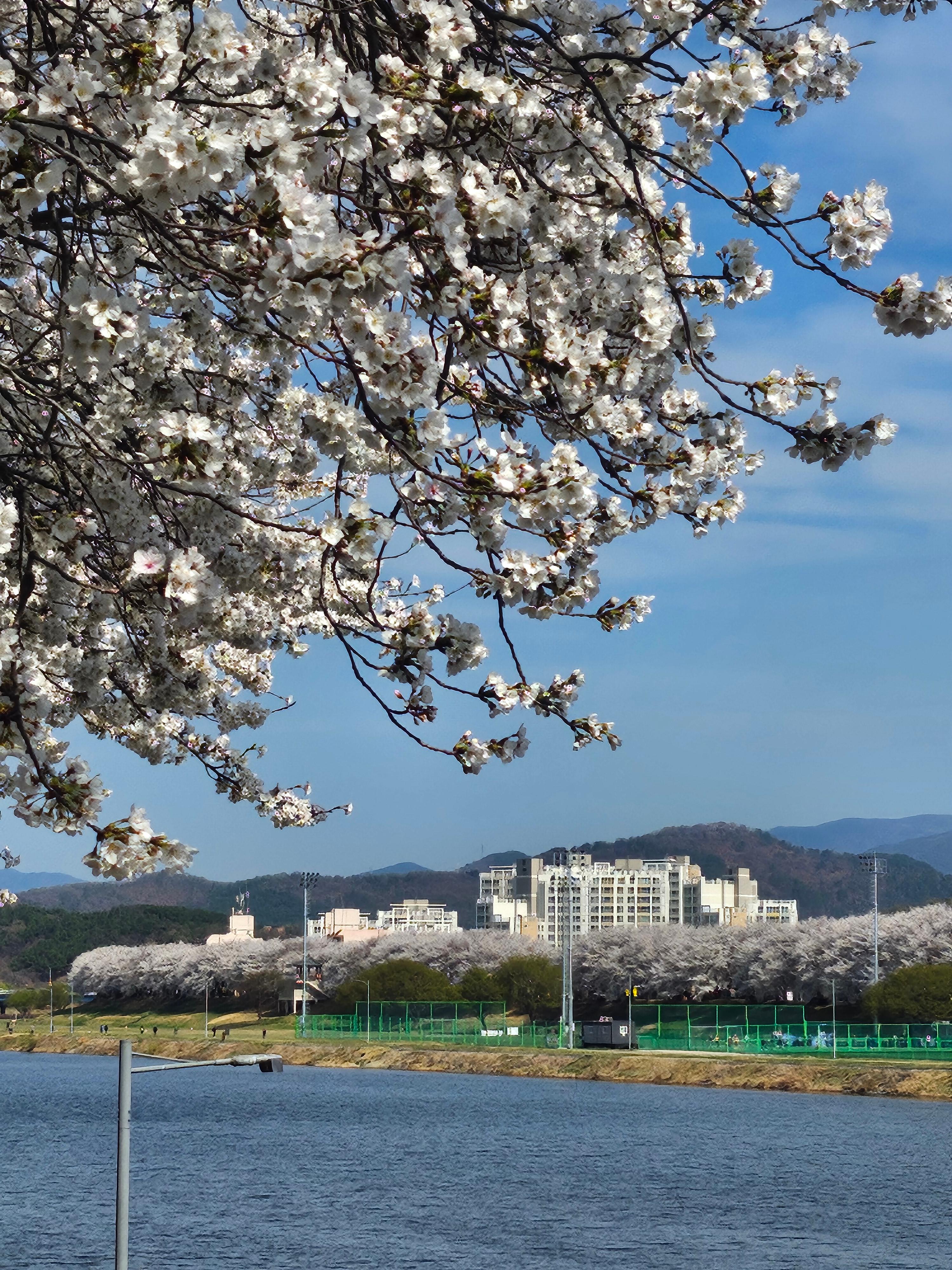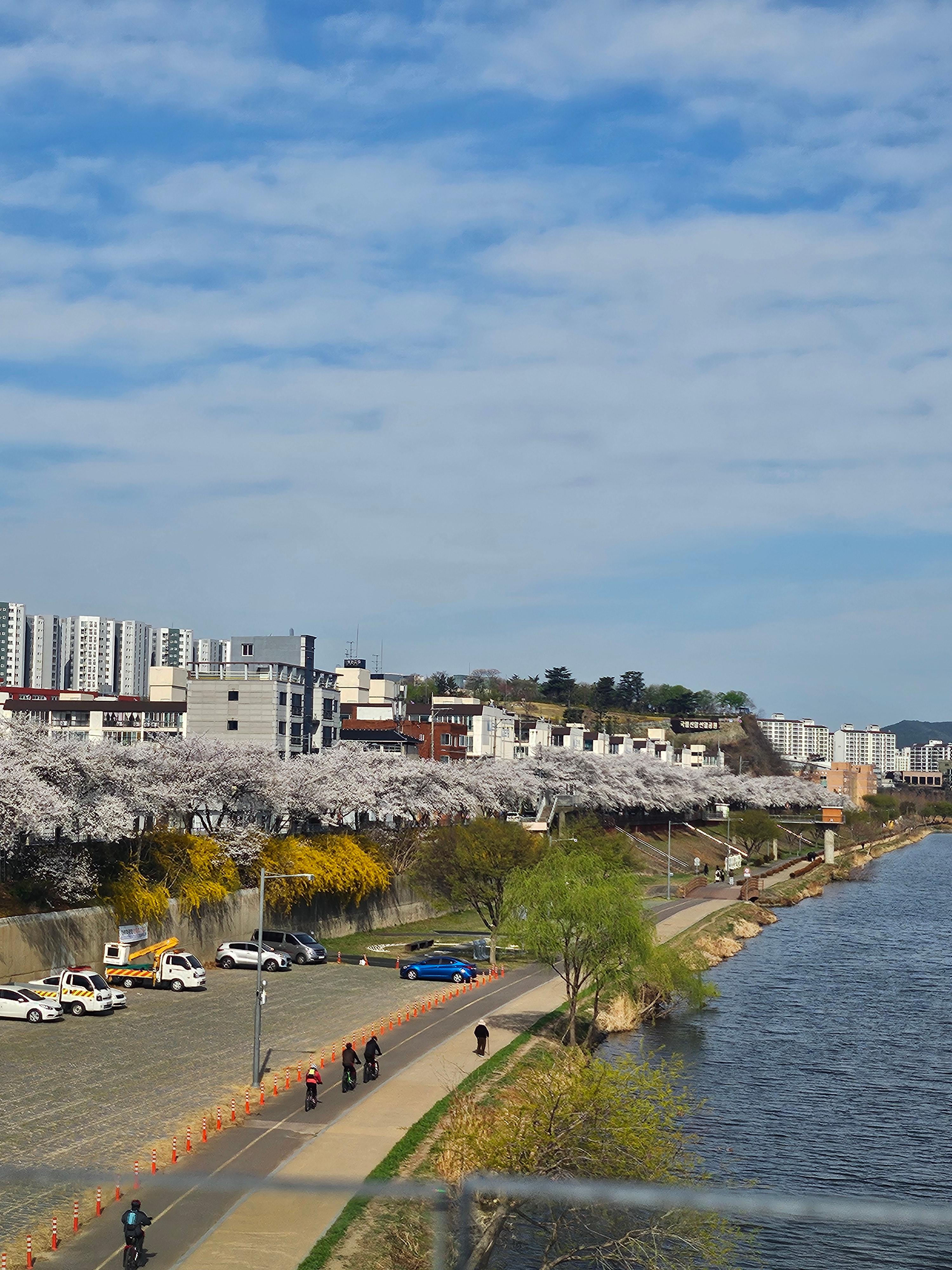 금호강 중앙쪽에서 양옆으로 벚꽃들이 엄청나게 많이 깔려있다.