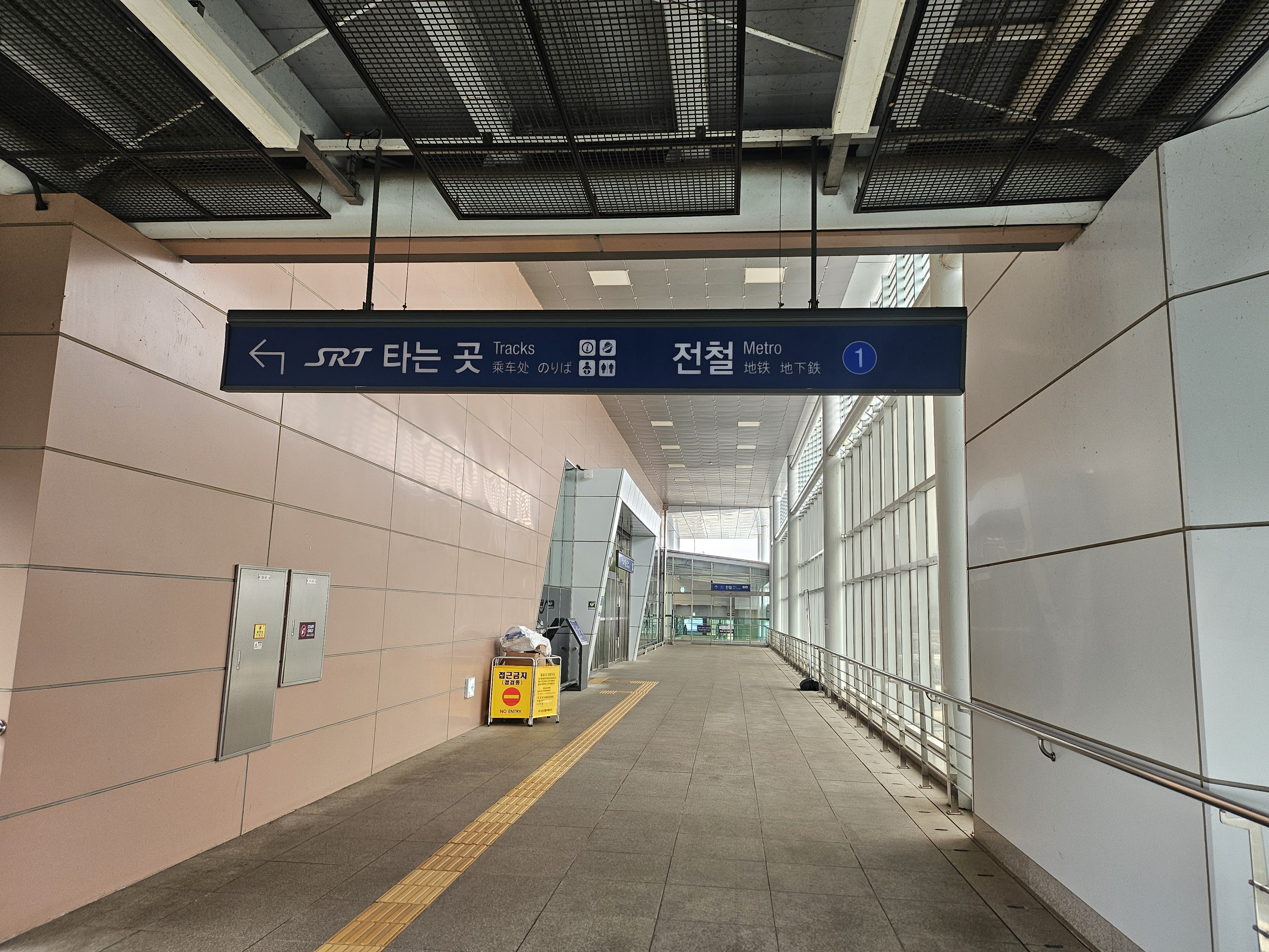 평택지제역에 내린 뒤 플랫폼으로 가게 되면 플랫폼에서 1호선 타는 곳과 srt 타는 곳으로 나뉘어져 있다. 총 3개의 플랫폼이 있는것 같고, 1번 플랫폼과 2번 플랫폼이 있는데 1번 플랫폼은 상행선(수서쪽), 2번 플랫폼은 하행선(대구쪽)이다. 1호선을 타려면 지금 보는 것처럼 플랫폼을 통과해서 뒷문(?)으로 나와서 전철 1호선 표지판을 보고 가면 된다.