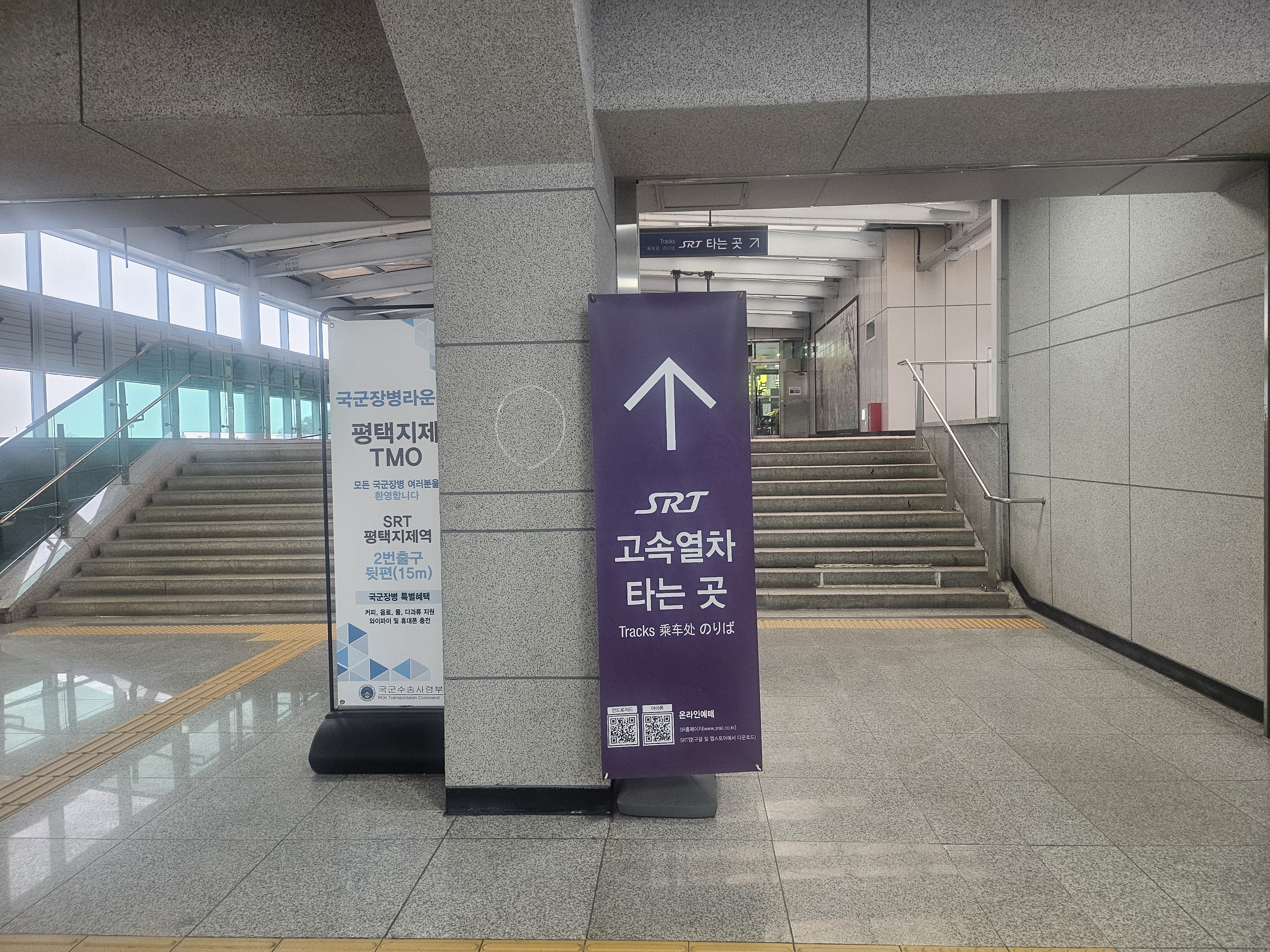 반대로 1호선을 타고 평택지제역에 하차한 후 플랫폼을 올라가면 위 사진과 같은 장면을 만나게 되는데 1호선으로 평택지제역에 내린 후 SRT를 타려면 위에 있는 엑스배너를 보고 평택지제역 플랫폼 안으로 들어간 다음, 거기에서 1번 혹은 2번 플랫폼으로 들어가면 된다.