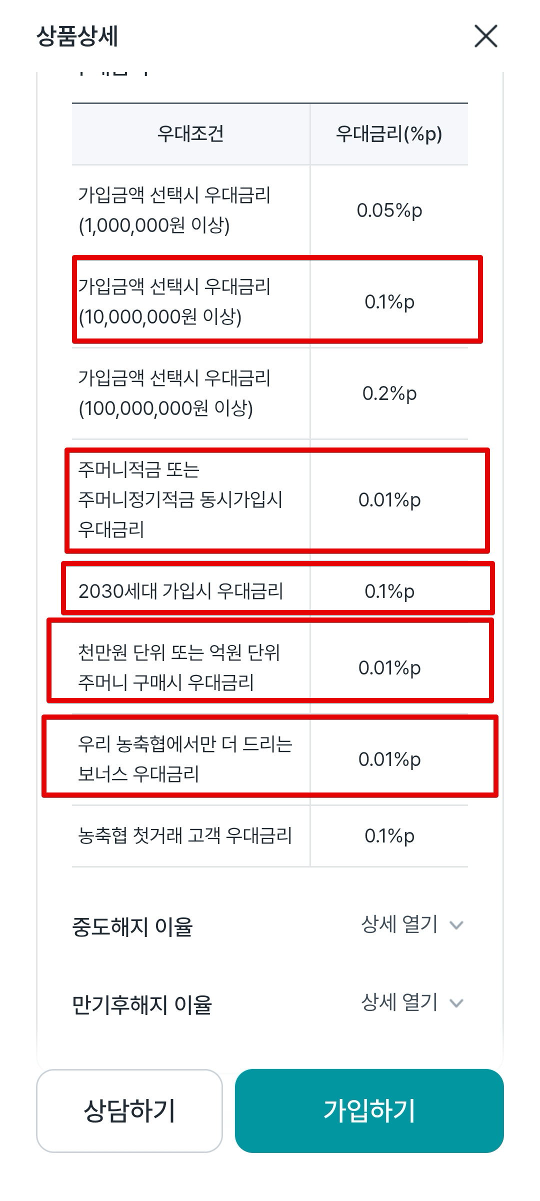 우대금리 같은 경우 여러가지 혜택을 볼 수 있는데 대표적으로 받을 수 있는 것들을 체크하면 위와 같다. 1000만원 가입으로 0.1%, 주머니적금 동시가입(3개 가입하면 됨)으로 0.01%, 2030으로 0.1%, 천만원 단위로 가입시 0.01%, 해당 농축협에서만 주는 우대금리 0.01%를 받으면 된다.