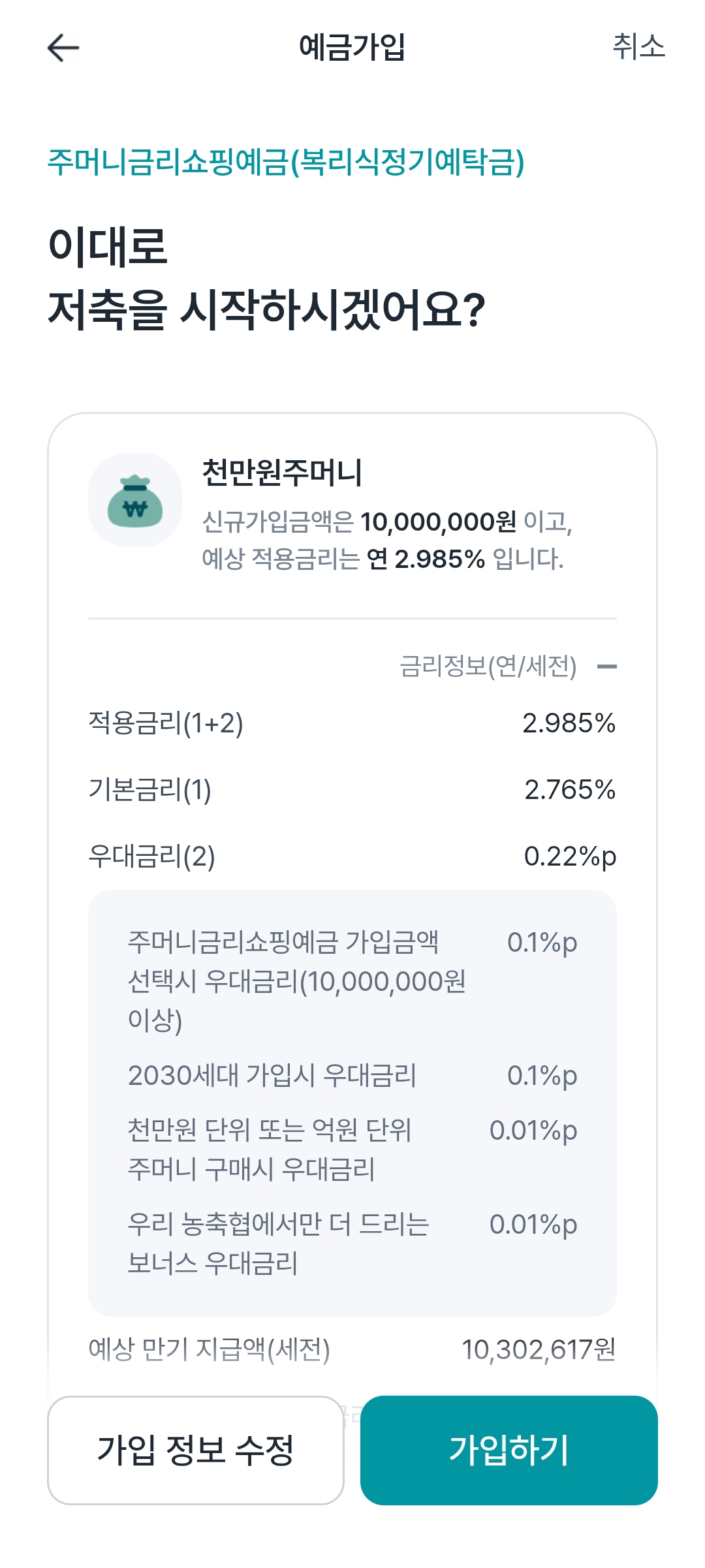 이렇게까지 받게 되면 기본금리 2.765 + 0.1 + 0.01 + 0.1 + 0.01 = 2.985%의 금리를 받을 수 있게 된다. 세전으로 대략 3% 수준이다.