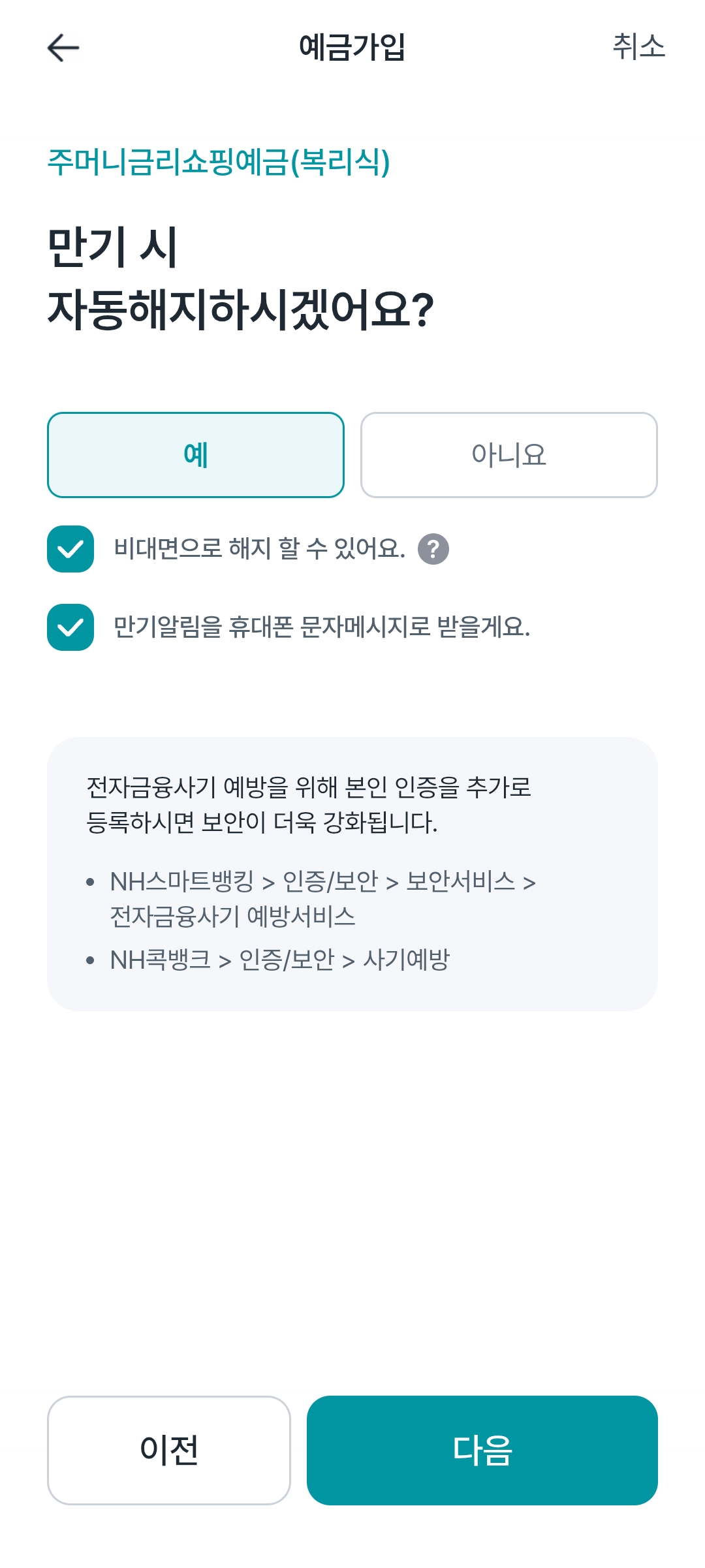 이자 지급 방식은 만기일시지급밖에 없어서 선택지가 없다. 다음으로 만기시 자동해지는 해두는게 훨씬 더 편리하다. 해지되면 문자도 보내주고 자동으로 해지되면서 기존 가입 계좌로 돈이 들어와있기 때문에 곧바로 다시 가입하기에도 유리하다. 비대면으로 해지하도록 하고 만기알림을 휴대폰 문자메시지로 받기로 하면 된다. 더불어서 미리 계획하기 위해서 달력이나 캘린더에 만기 일정을 기록해두고 미리미리 재가입 준비를 해두도록 하자.