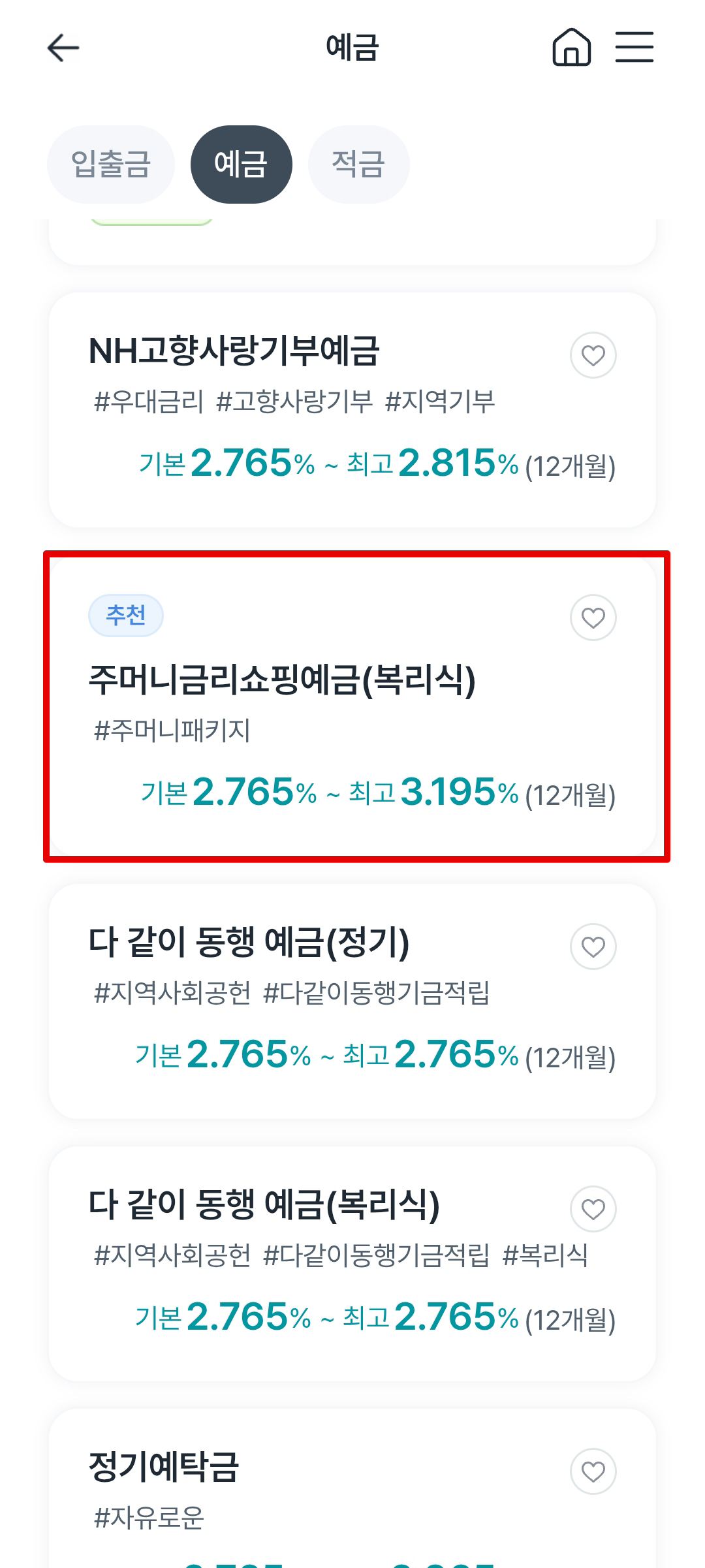 예금 상품 중에서 농특세 과세 3000만원 저율과세 상품으로 적합한 상품은 [주머니금리쇼핑예금(복리식)]이다. 여기에서 말하는 복리는 월복리이다. 하지만 12개월로 만기가 짧기 때문에 월복리 효과는 그렇게까지 크다고 보긴 어렵지만 없는것보다는 낫다. 가장 나은 금리를 주는데다가 우대금리 항목이 많고 가입기간 12개월로 적당하므로 해당 재테크 전략에 가장 최적화된 상품으로 보인다.