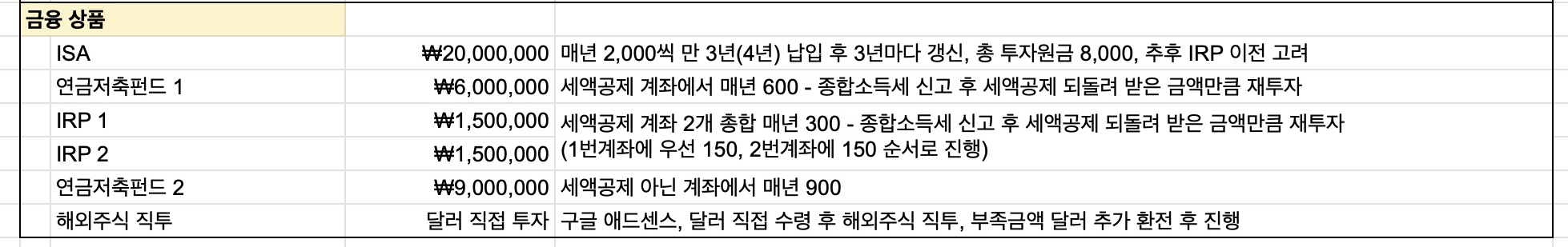 이제 아파트 매도 잔금까지 받은 상황이라서 재테크를 다시 시작해줘야하는 시점이었으므로 시간을 내서 비과세 및 저율과세 상품과 내가 투자해야할 절세계좌들, 그리고 해외주식 직투 계좌 등을 어떤 순서로, 어떤 증권사에서, 어떤 방식으로 할지 고민하면서 스프레드시트를 통해 표를 짜보았다.