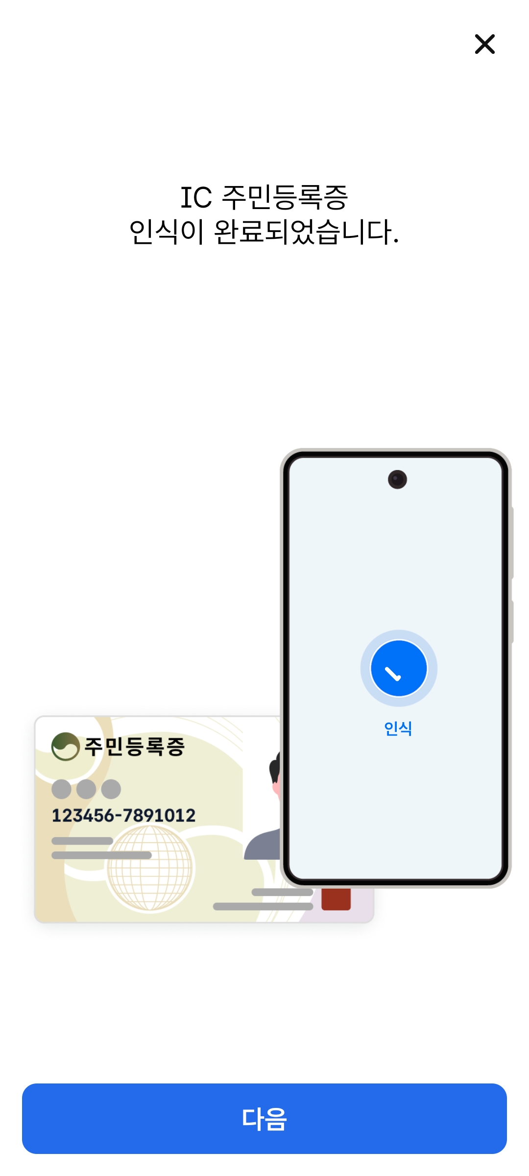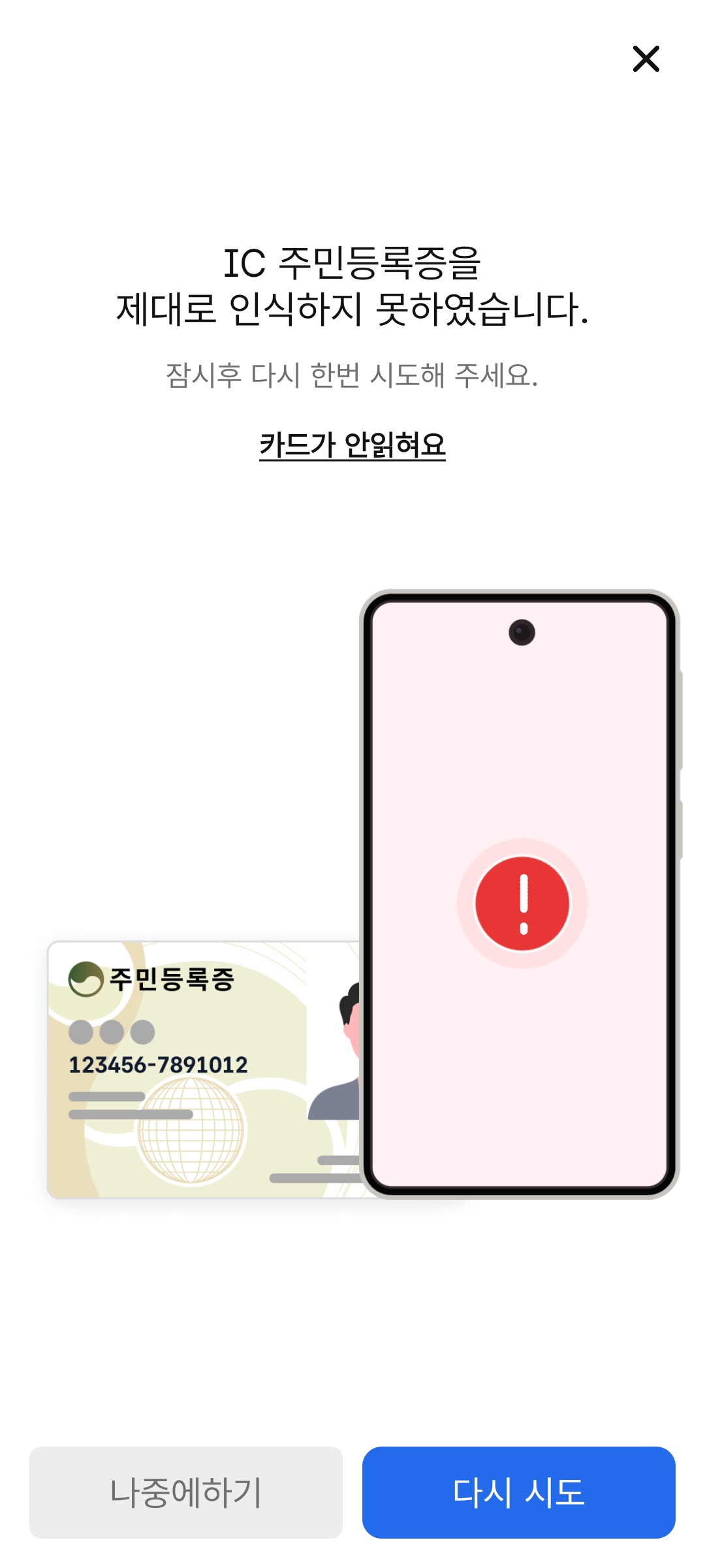 다음으로 스마트폰 뒷면에 실물 신분증을 갖다 대서 인식시키면 되는데 처음에 시도할 땐 비벼야되는줄 알고 비볐더니 인식 실패가 떴다. 그래서 비비지 말고 그대로 갖다 대고 잠깐 기다리면 인식되면서 모바일 주민등록증이 발급된다.