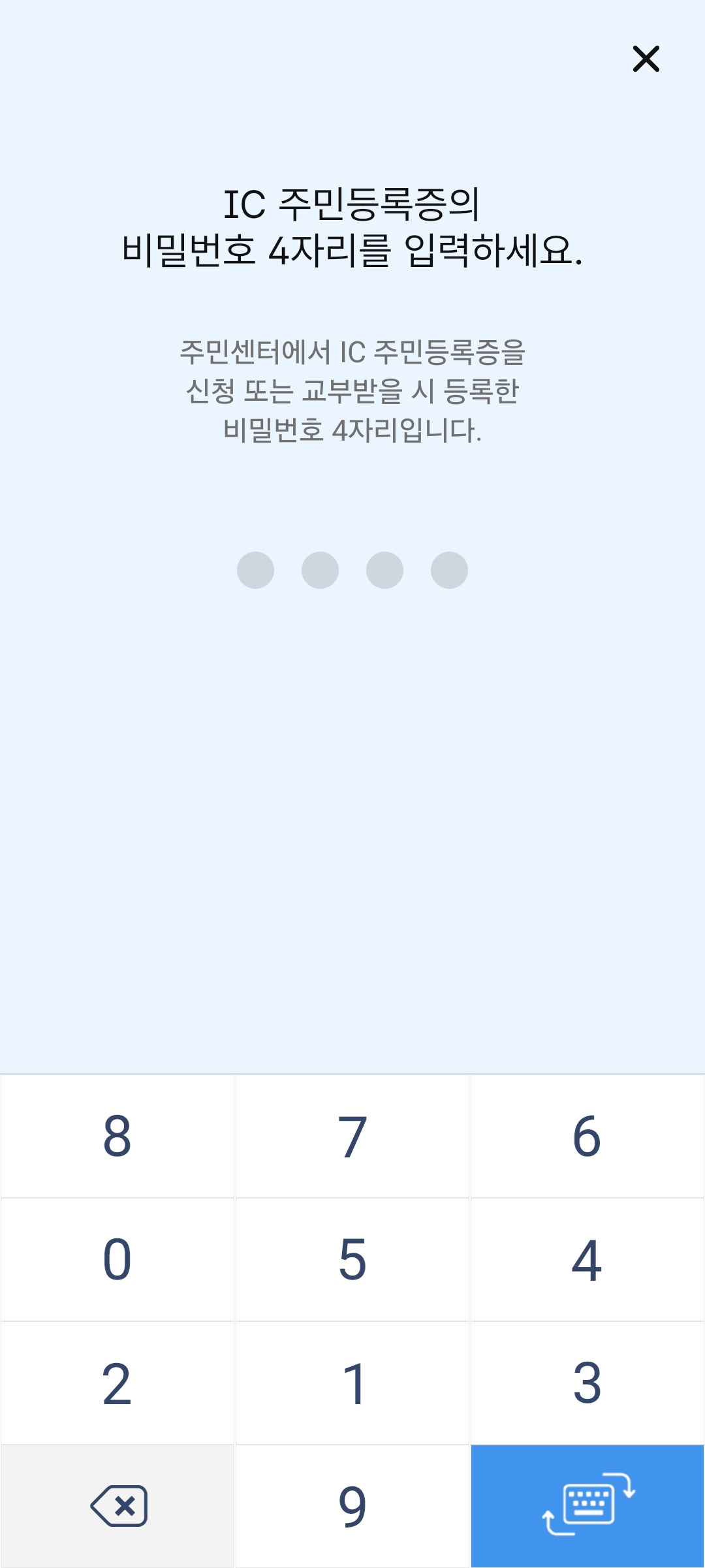 이때 IC주민등록증으로 모바일 주민등록증을 발급할 때 비밀번호 4자리를 입력해야하는데, 이 비밀번호는 행정복지센터에서 IC주민등록증을 신청할 때 요청받았던 비밀번호다. 이거 깜빡하면 큰일날 것 같으니까 기억하기 쉬운걸로 해두자.