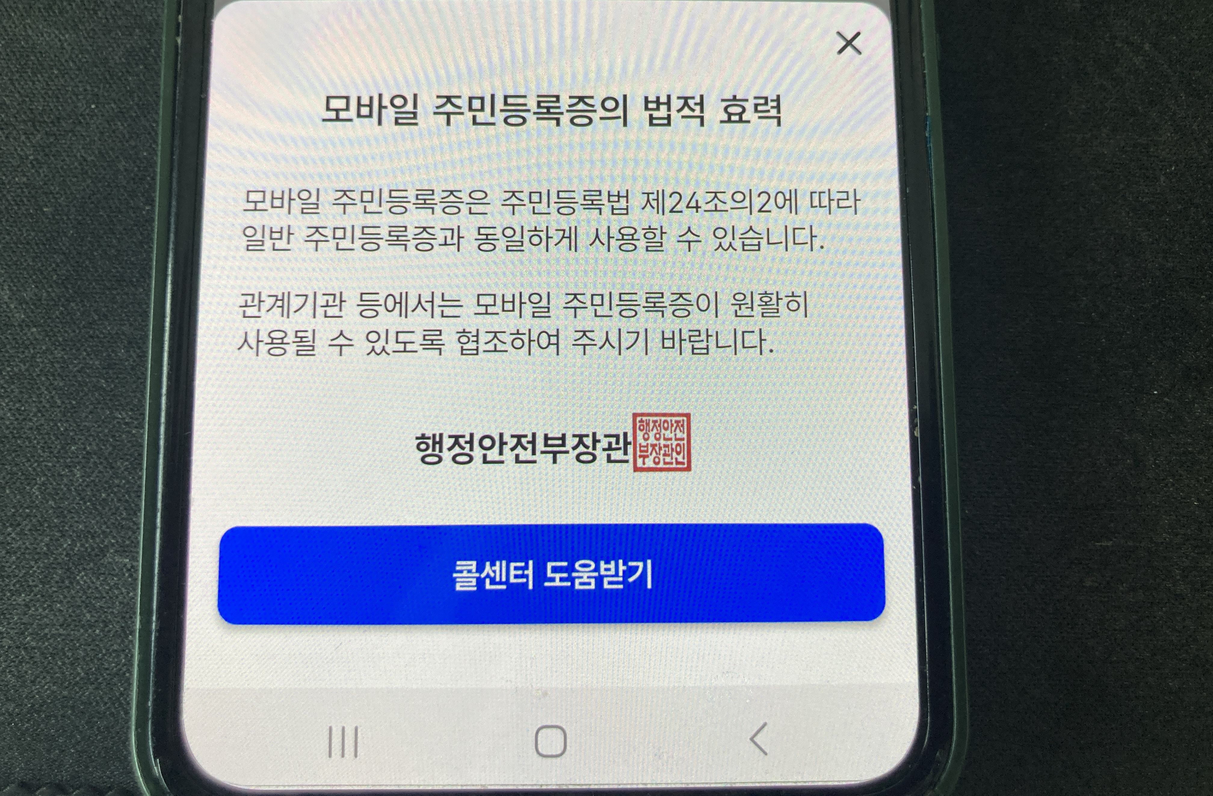 일단 모바일 주민등록증의 법적 효력부터 체크해보자. 이 화면은 실제로 모바일 주민등록증을 발급받을 때 나타나는 화면인데 캡처가 막혀있어서 다른 폰으로 찍었다.