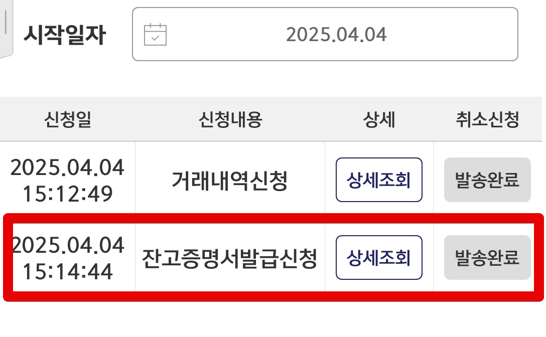 신청 내역에 들어가면 이런식으로 잔고증명서발급신청 항목을 볼 수 있는데 이메일로 받기로 했으므로 이메일을 열어보면 된다. 발송완료가 떠 있다면 곧 이메일이 도착할 것이다.