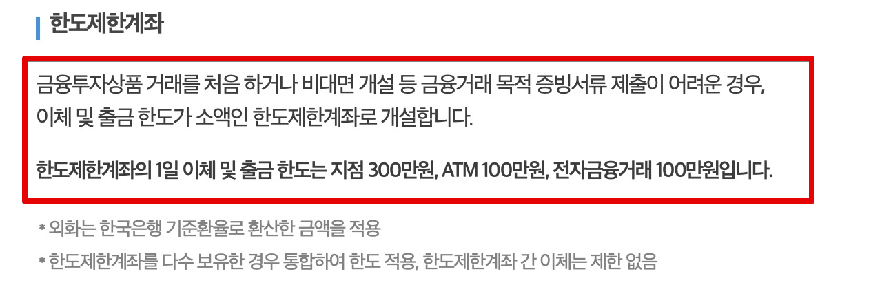 한도제한계좌는 내가 볼 땐 말이 안되는 금융 규제이다. 왜 말이 안되냐면 전자금융의 경우 이체한도가 1일 100만원으로 제한돼 있는데 웃긴게 보유는 100만원 이상이 또 된다. ㅋㅋㅋ 그러니까 100만원씩 3일간 이체해서 300만원 맞추면 보유금액은 300만원인데 이체는 하루에 100만원만 할 수 있는... 어이없는 상황이 펼쳐진다. 내 돈을 내가 원할 때 내가 못써버리는 경우가 발생할 수 있다.