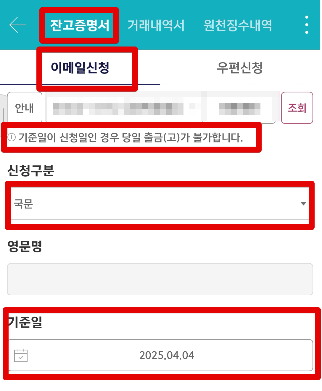 상단에서 [잔고증명서]를 체크하고 발급을 시작한다. 기준일 명시해야하고 국문으로 표시한다. 이때 기준일이 신청일인 경우에는 당일 출금이 안되니 주의하자.
