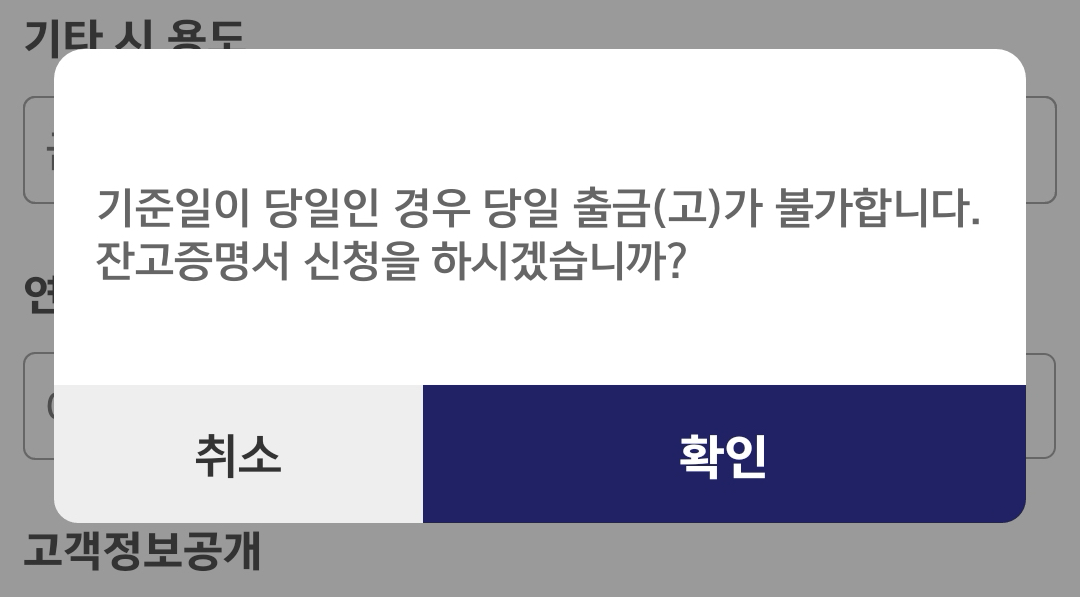 용도에는 기타로 잡고 금융기관제출로 설정했다. 다시 한 번 당일 출금 안된다고 알려준다.