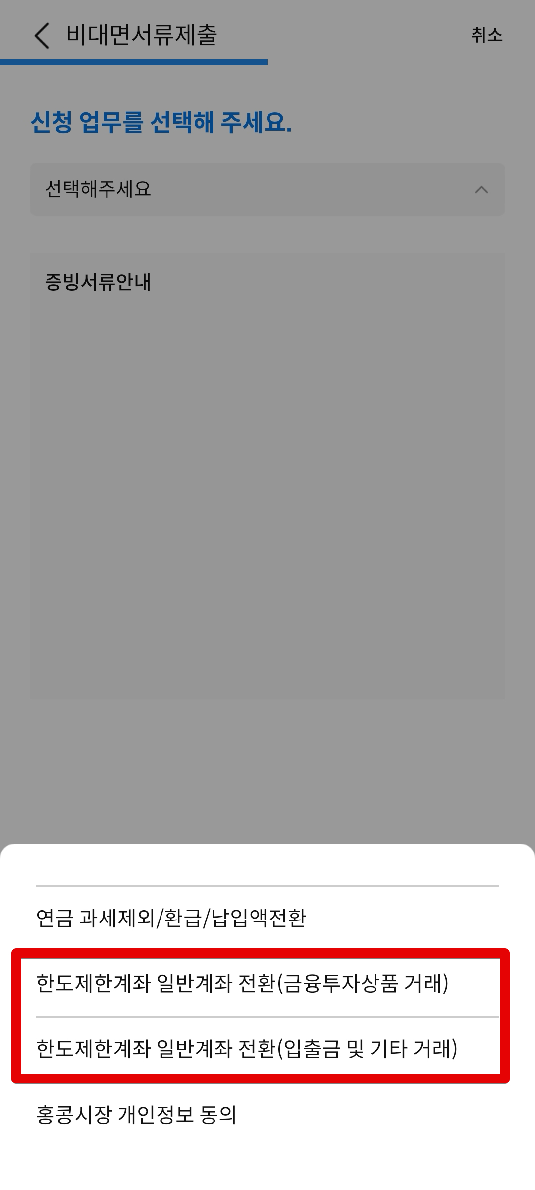 신청할 때 두 가지가 있다. 한도제한계좌 일반계좌 전환(금융투자상품 거래)쪽이 있고, 한도제한계좌 일반계좌 전환(입출금 및 기타 거래)쪽이 있다. 여기에서는 당연히 금융투자상품 거래쪽으로 가야한다.