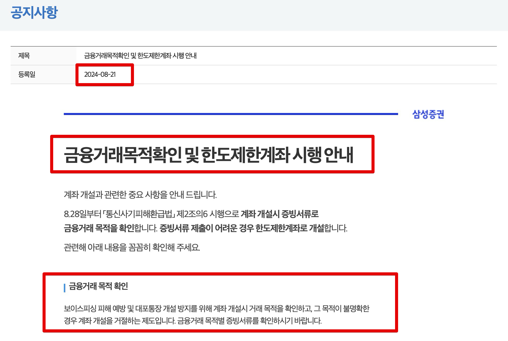 일단 삼성증권 홈페이지에서 금융거래목적확인 및 한도제한게좌 시행 안내 공지를 읽어보자. 2024년 8월 말경에 추가된 공지인데 2024년 8월 말부터 통신사기피해환급법 시행으로 계좌 개설 시 증빙서류 제출 안하면 한도제한계좌로만 개설된다.