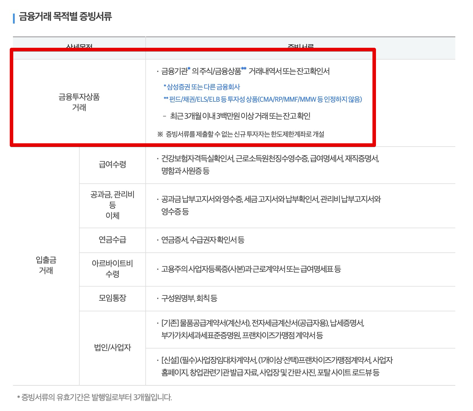 삼성증권은 금융거래목적별로 다른 증빙서류를 요구한다. 금융투자상품 거래를 위해서는 금융상품 거래내역서 또는 잔고확인서를 제출해야한다. 입출금 거래일 경우에는 다른 증빙서류가 필요한데 예를들어 급여수령쪽 서류를 보면 무슨 서류를 5개 이상을 갖다 내라고 하니까 치가 떨린다.