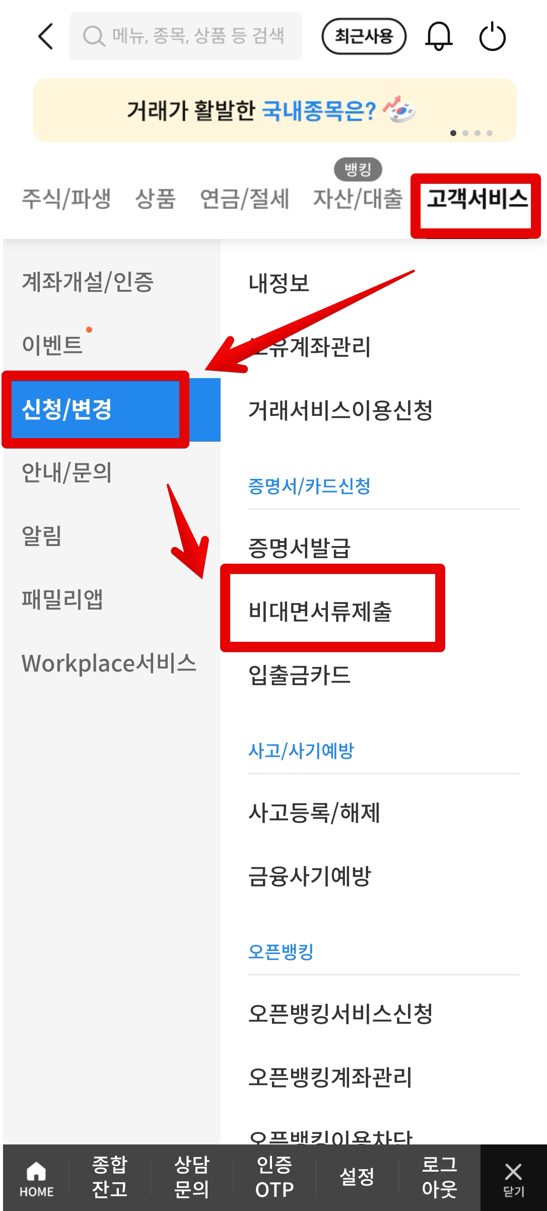 삼성증권 앱에서 전체 메뉴에서 [고객서비스] - [신청/변경] - [비대면서류제출]로 들어간 후 [서류 제출 신청]을 클릭한다.