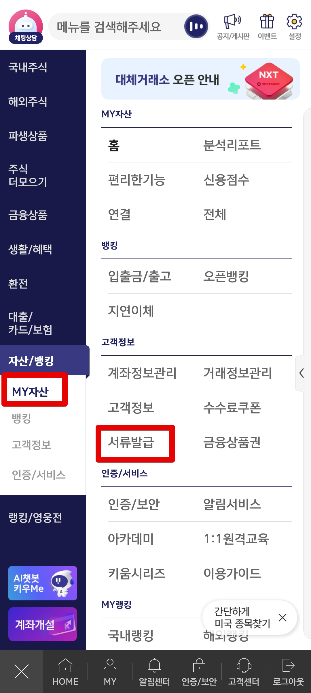 영웅문 S# 앱 들어간 다음 메뉴에서 [MY자산] - [서류발급]으로 들어간다.